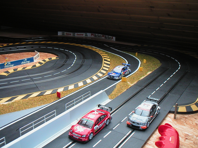 hermes am 06.10.08 um 13:54Ich mach's auch ganz kurz: Überlege dir genau, mit welchen Autos du fährst und sage nie "Nie"! Deine Bahn ist für 1:32er mit Magnet geeignet. Richtig Spaß macht es aber erst, wenn du die Anzahl der Magnete mal reduzierst oder ganz weglässt. Zusätzlich könnte man vor dem Festaufbau mal überlegen, ob man vielleicht auch mal 1:24er fahren möchte. Kurzum: du hast zu wenig Randstreifen, und an einigen Stellen auch keine Möglichkeiten, welche anzubringen (Bild 3). Ich würde das nochmal überdenken.