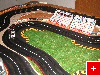 Tomegger am 06.01.09 um 22:34Die Boxenmauer ist von Fly, ebenso wie die Boxengasse. Alle Artikel müssten eigentlich noch erhältlich sein. Im Bereich des Rundenzählers habe ich die Mauer problemlos mit eine kleinen Säge und scharfen Messer herausgetrennt um den Zähler einzupassen, damit es etwas eleganter aussieht. Desweiteren habe ich auch die Endstücke der Mauer etwas abgeändert Die Zu- bzw. Abfahrt aus der Box ist aus 8mm Sperrholz (optimale Höhe zu den Carrera-Schienen), Schwarz lackiert und begrünt. Die Streckenlänge beträgt ca. 19,50m.