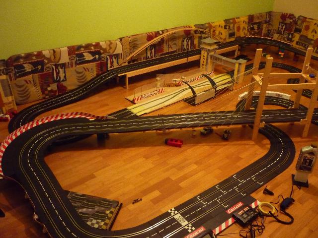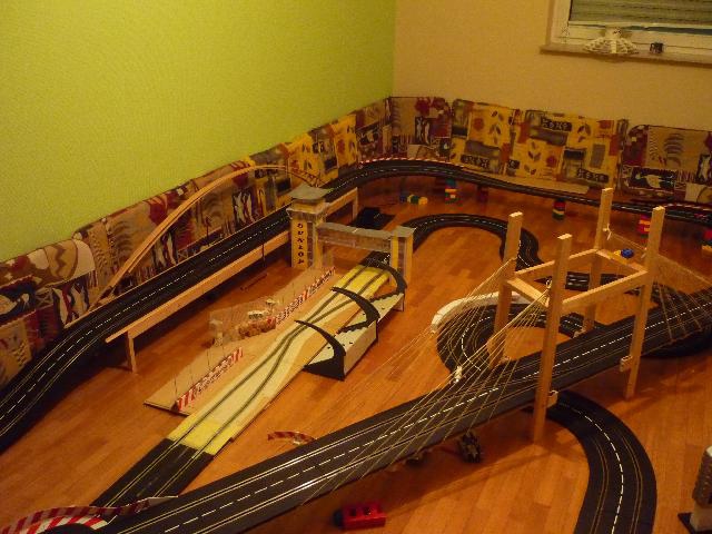 Da ich leider keinen Platz für einen Festaufbau habe, sondern meine Bahnen immer im Gästezimmer aufbauen muss, ist eine richtige Ausgestaltung der Bahn aufgrund des häufigen Auf- und Abbauens leider nicht so gut möglich. Zurzeit allerdings steht das Zimmer meiner Schwester leer da sie neue Möbel bekommt (zum Glück erst in zwei Wochen) und diese Gelegenheit habe natürlich sofort genutzt um meine Rennbahn dort aufzubauen. Ich hatte auch zum ersten mal genug Platz alle meine selbsgebauten Bahnteile zu integrieren.