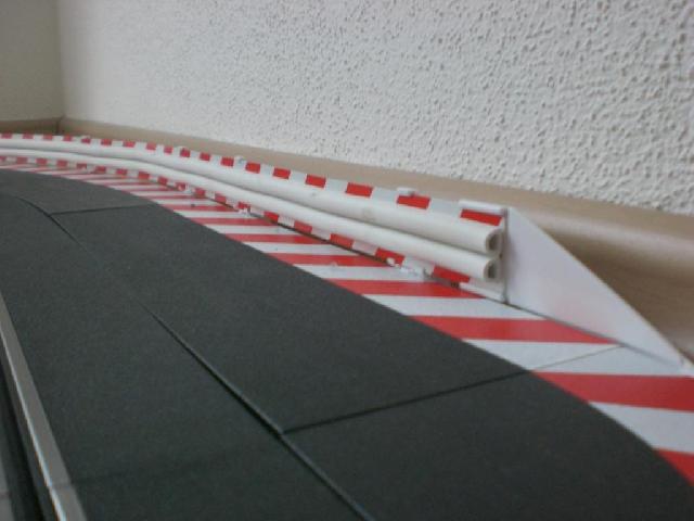 Dieses habe ich, ohne es in der Mitte in ein Einfach-D-Profil aufzusplitten an die Leitplanke geklebt, trotz inzwischen vorhandener Randstreifen. Sieht für mich durchaus authentisch aus und schützt die Fahrzeuge bei Abflügen an diese.