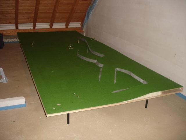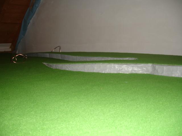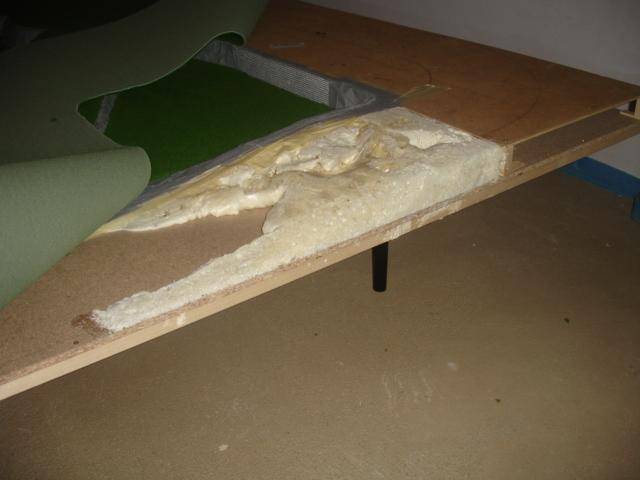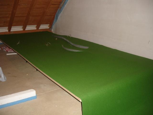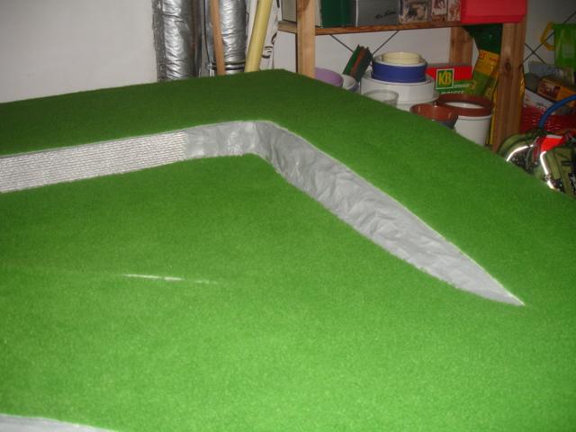 nach einem Besuch beim Teppichhändler geht den Bau weiter. Zuerst wurde aber die Zusatzeinspeisungen verlegt. Alle Kabel (Zusatzeispeisung, IR-Türme und Rundenzähler!) verlaufen natürlich unterhalb der Platte. Mit Hilfe von Isolierschaum wurde Stütze für die Überfahrtteile geformt, damit auch diese Schienenteile perfekten Halt bekommen. Die Felsen grau bemalt und schon darf den Rasenteppich verlegt werden....