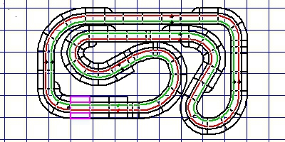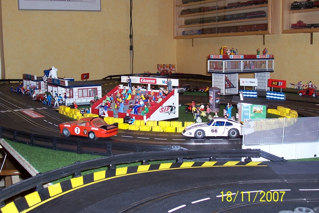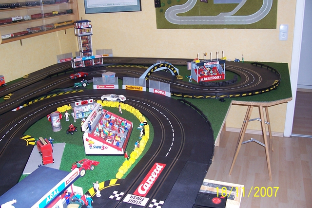 Die Spannungsversorgung wird mit zwei umschaltbaren Carrera-Exclusiv-Trafos mit 6 Einspeißungen bedient und für die Zeitmessung verwende ich RaceControl und einen Windows98-PC.