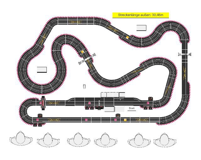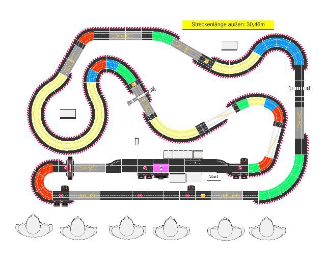 Für die Planung habe ich schon den neuen Autorennbahnplaner benutzt. Die geplante Strecke schon mal anbei. Nach dem Aufbau folgen dann noch Streckenphotos.