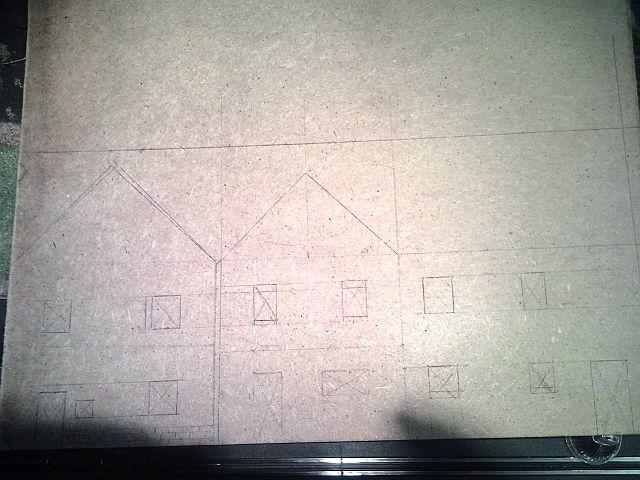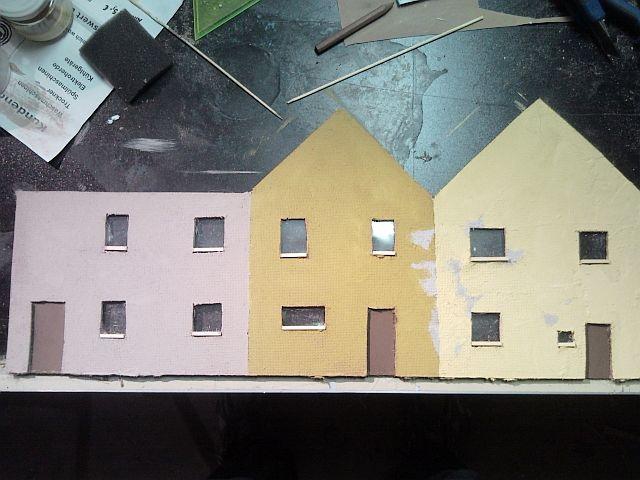 Bild 5 Die Häuserfront 5cm tiefes Relief zwar mit Farbe aber es fehlt halt noch einiges und die Dächer haben auch noch keine Ziegeln, Bild 6-8 Die Häuser auf ihrem geplanten Platz.(sehe gerade die Bilder sind in der umgekehrten Reihenfolge nummeriert)