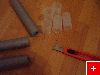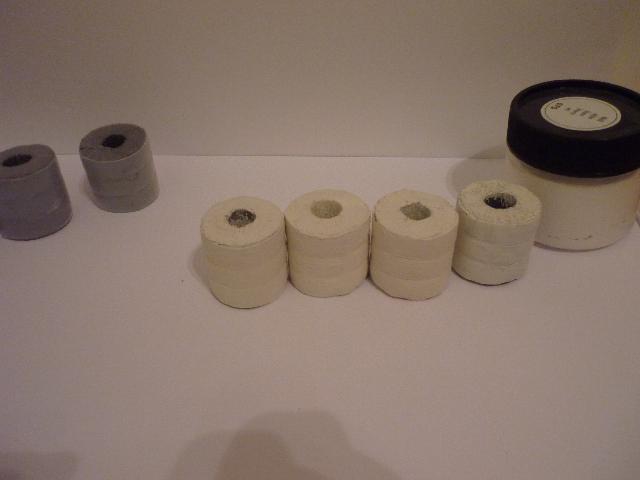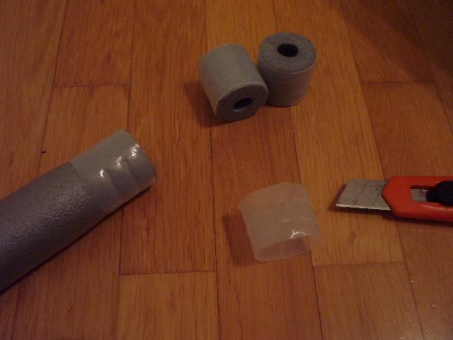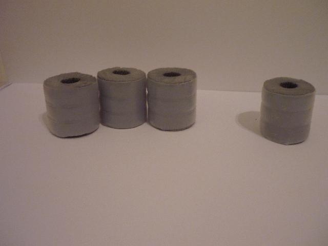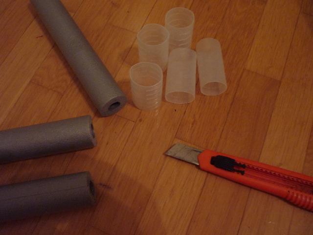 Für die Reifenstapel hab ich mir im Baumarkt einige Kunststoff-Steckmuffen (Durchmesser 3,2cm; Länge 6cm) und Kautschuk-Rohre (Gesamtdurchmesser 3,5 cm; Durchmesser des Loches in der Mitte 1,6 cm), die normalerweise zur Isolierung von Rohren verwendet werden, besorgt.