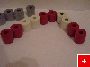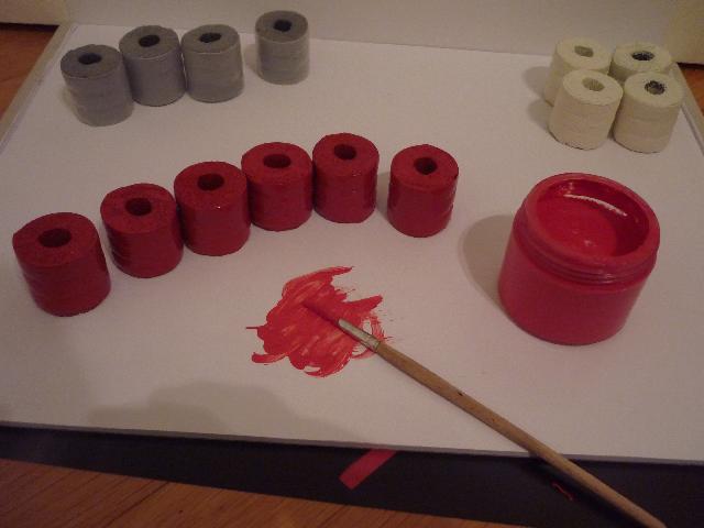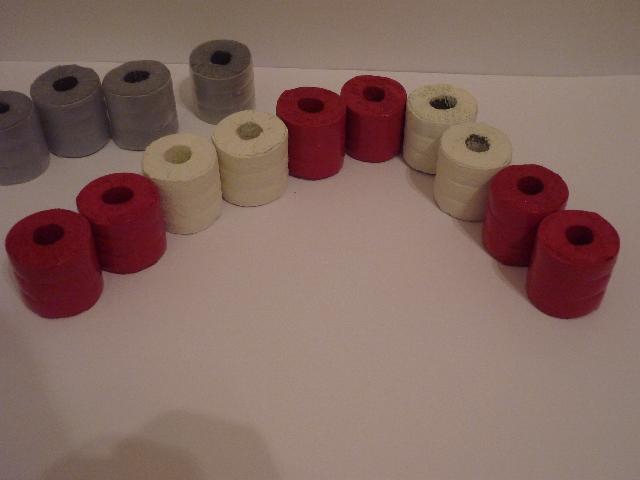 Als erstes wurden die Muffen mit Hilfe eines Cuttermessers halbiert, einzeln auf die Kautschuk-Rohre gestülpt und dann abgeschnitten. Zum Schluss hab ich sie noch angemalt (Rot und Weiß mit Farben von Revell).