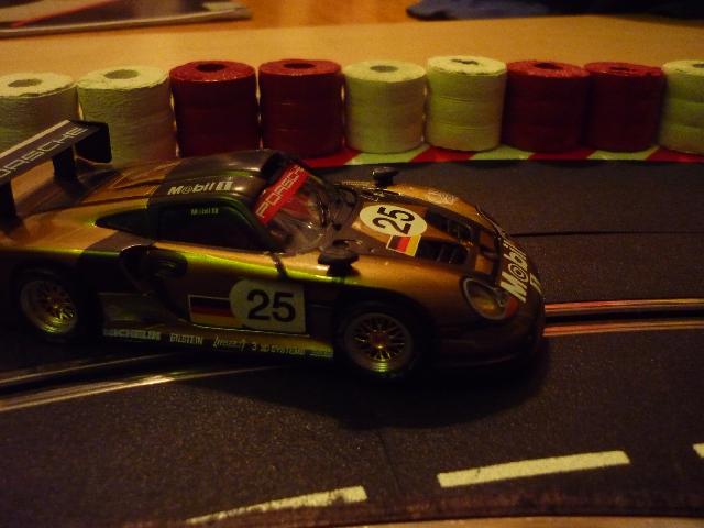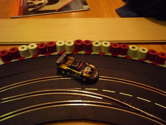 Die Reifenstapel sind vielleicht nicht ganz Maßstabsgetreu im Verhältniss zu den Bahndekorationen von Carrera (Tribünen, Figuren, usw.) aber ich finde sie sehen gar nicht so schlecht aus.