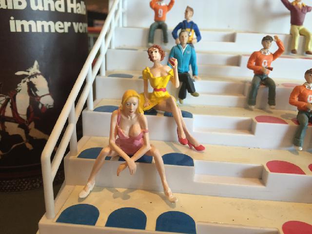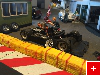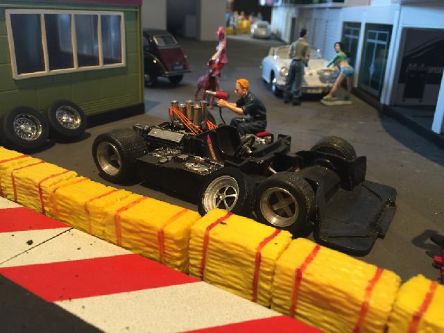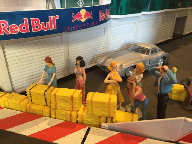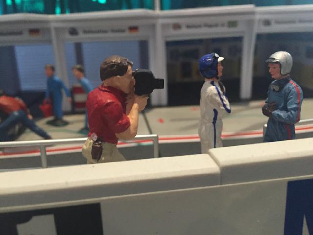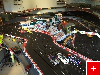 Nachdem ich gemerkt habe, wieviel Zeit schon wieder vergangen ist, zeige ich 'mal einige aktuelle Bilder von der Bahn. Die ersten 3 Bilder sind ?bersichtsfotos. Bild 4 zeigt die erste Schikane. Vorher war das nur ein kleiner Rechtsknick K2/3. Hier wollte ich eine etwas grö?ere Schwierigkeit setzen. Der grö?te Umbau zeigt sich auf Bild 5. Ich habe die obere SK 3/4 abgebaut und durch eine Flachkurve samt Schikane ersetzt. Die Schikane sollte aber flüssig sein, deshalb habe ich eine K3 in der Mitte zersägt, so dass die Schikane K3/4 15 Grad eingeleitet wird. Mt der anderen Hälfte der zersägten K3 wird am Ende der Schikane wieder auf 30 Grad ausgeglichen. Die anderen Bilder zeigen einige Figuren.