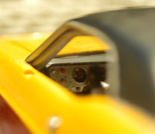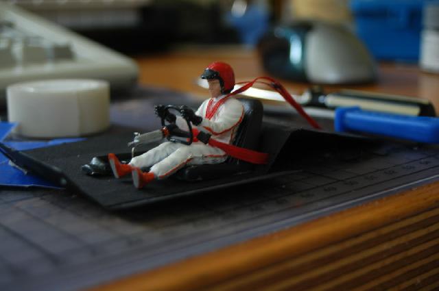 Der Fahrer selbst ist ein wenig nachgearbeitet - ich habe ihn ein wenig in den Sitz gepresst, ihm den Hintern abgefräst und die Rückenpartie annähernd formschlüssig dem Sitz angepasst - das sind entscheidende Millimeter für den Erhalt der Füsse, die sonst hätten dran glauben müssen, um die Einbauhöhe zu erreichen. Der "Dreipunkt-Gurt" ist aus einem Textilband und ein wenig Farbe selbst hergestellt. Das Lenkrad ist aus dem Bausatz.