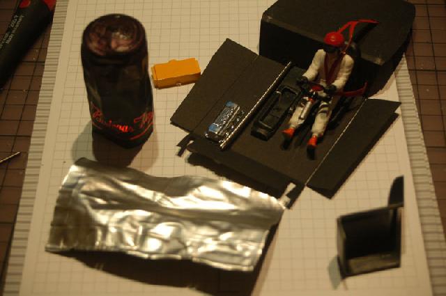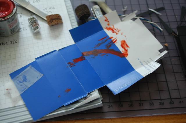 Der Verschluss wird entweder (sauber) abgeschnitten oder abgezogen. Danach geplättet und das benötigte Material ausgeschnitten - am besten geht dies mit einem Skalpell. Nun mit einem Stück Holz in Form gebracht und auf Länge geschnitten. Bild 5 zeigt den Fahrereinsatz mit dem Versorgungsschacht - der übrigens die Pappkonstruktion zusätzlich stabilisiert/versteift.
