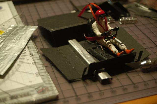 Die nächsten Schritte sind nun noch die Verklebung der Seitenwangen und "befüllen" des Innenraums mit Kabelsträngen, Lachgas-Kartuschen, Feuerlöschern, Batterien oder was einem sonst noch so einfällt. Ich habe hier der Einfachheit und zugegebendermaßen aus Mangel an "Kleinteilen" eine Batteriebox eingebaut und ein paar Kabeltränge nach hinten geführt. Bild 7 und 8 versuchen einen Einblick zu geben, wie es aussieht, wenn Sitz und Fahrer an der richtigen Position fixiert, der Gurt gestrafft und der Einsatz mit der Karosserie verklebt wurde.