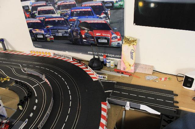 Zudem habe ihc in der Letzten Kurve wieder eine "Einfahrt"zum CentrO. Ring gebaut, wo sich in den nächsten Monaten noch ein paar Garagen wiederfinden lassen. Hier habe ich die Original Carreraleitplanken verwendet, da ich davon noch ein kleines Stück über hatte.