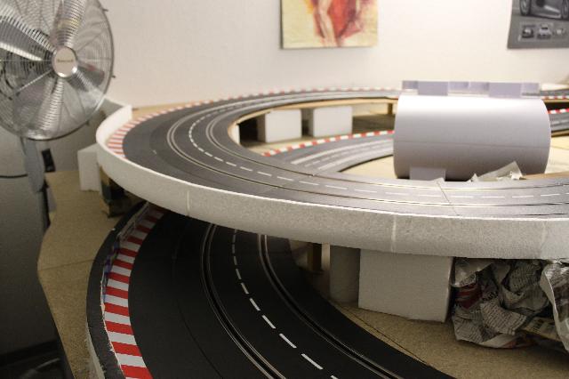 Die Styropor Leitplanken habe ich bei meiner alten Bahn mit Heißkleber auf dem Randstreifen befestigt. Da ich beim Abbau bemerkt habe, dass das ziemliche schweinerei ist, weil man die Randstreifen nicht mehr richtig sauber bekommt, habe ich diesmal mit Heißkleber zu erst eine Art ausgleich geschaffen und die Leitplanke dann darauf gesetzt. So kann ich die Schienen immer noch wegnehmen und die Leitplanke bleibt stehn. Werde die Tage nochmal bilder davon reinstellen. Dome