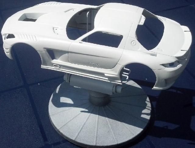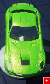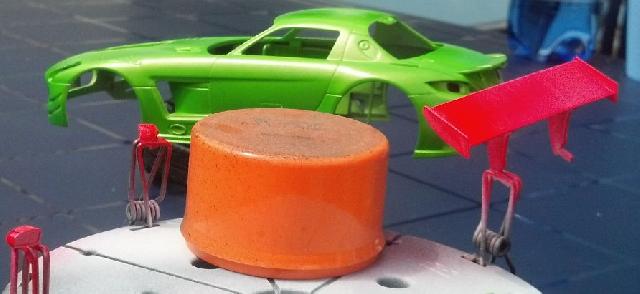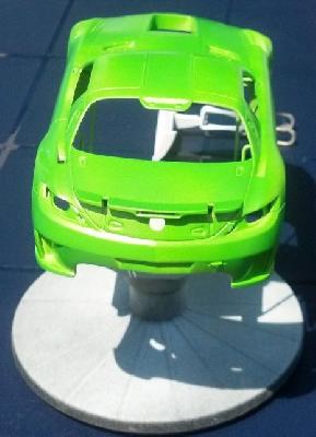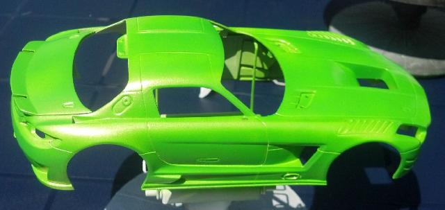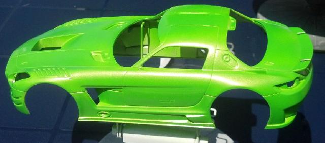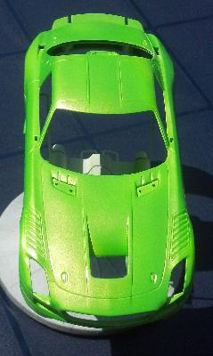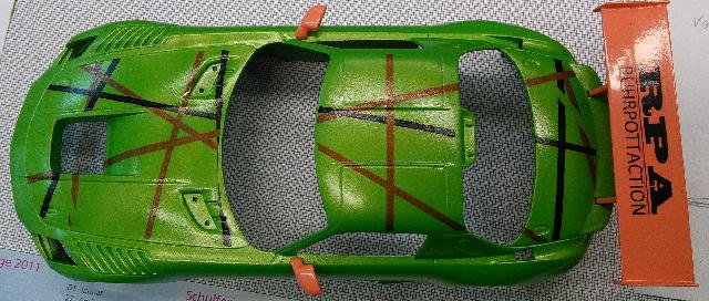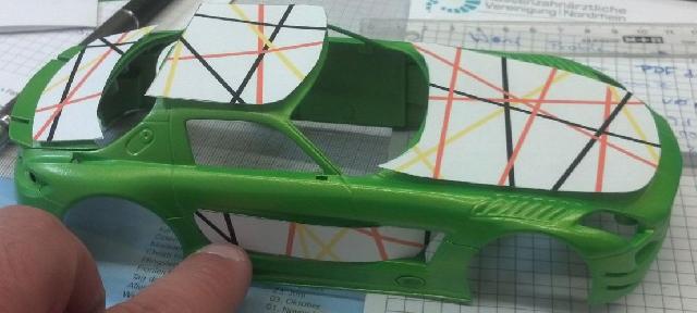 Grundiert, dann Grün lackiert, Farbe für Spiegel und Heckflügel geändert, die Schablonen für die Design Decals geschnitten.
