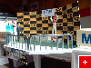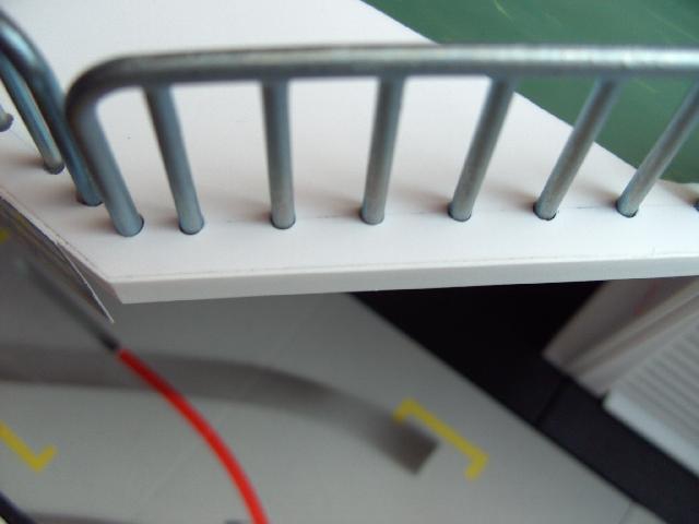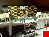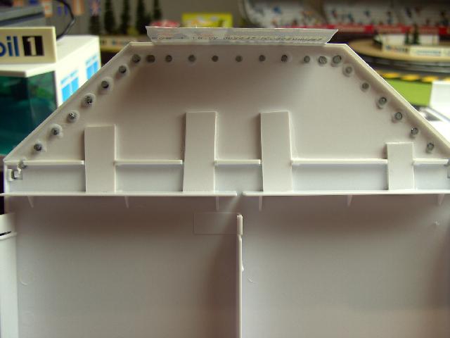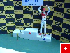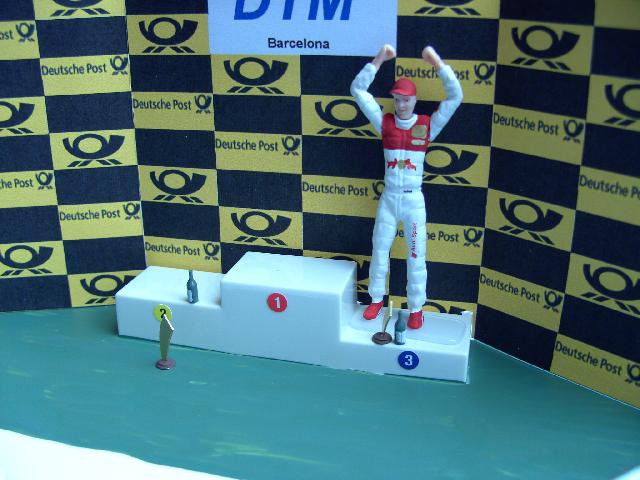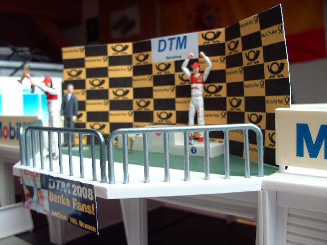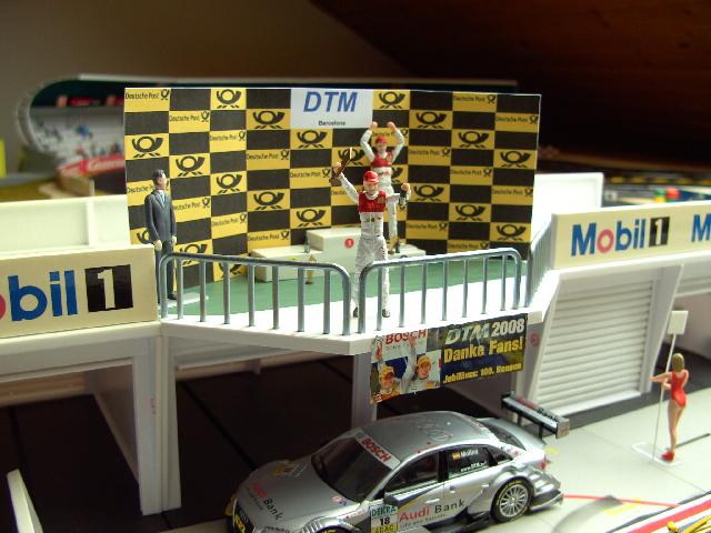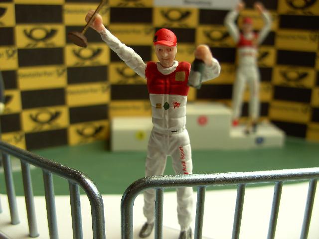 .... die zweite! In der Wartezeit auf die Decals und das Slotcar für mein nächstes Projekt, sollte auf Wunsch und nach Meinung meines Sohnes das Siegerpodest in das richtige Umfeld eingebaut werden. Seiner Meinung nach sieht eine Siegertribüne anders aus ;-) Also von seinem Bauernhof drei Siku- Gitter gerippt, auf 30mm Höhe abgesägt, die Abstände der Stäbe und die Dicke gemessen und dann die entsprechenden Löcher in eine 2mm Polystyrolplatte gebohrt. Dann die Platte mit 2mm Stücken in die entsprechend ausgeschittenen Stellen am Boxengaragendach ein- und mit dem Boxendach verklebt. Nach einem Tag Aushärtezeit wurde das Geländer mit Sekundenkleber nach genauem Abmessen der Höhe mit dem Dach verklebt. Eine Umrandung aus 0,75mm Material in der Stärke des Boxendaches wurde noch an den Vorderseiten angeklebt. Ein Auschnitt aus einem Foto als Plakat davorgehängt, der grüne Rasenteppich verlegt. Zum Schluss habe ich noch Pokale gebastelt, die Sektflaschen (aus einem alten Tamiya- Bausatz verteilt. Zwischendurch bekamen noch zwei der Fahrer einen "neuen" Rennoverall an und durften feiern. Habe auch ein paar Bilder angehängt. Gruss Berthold
