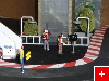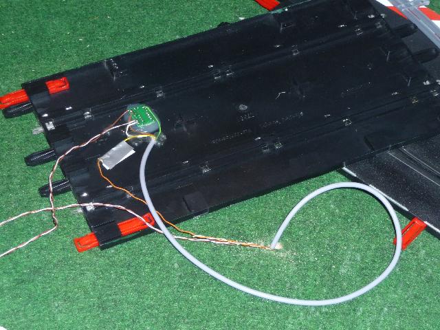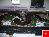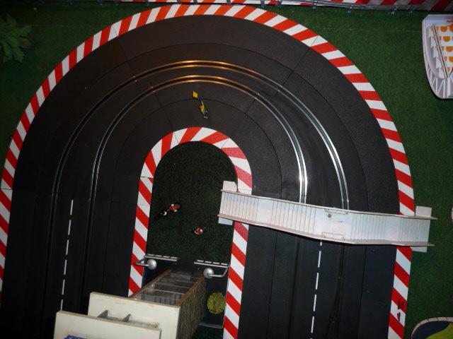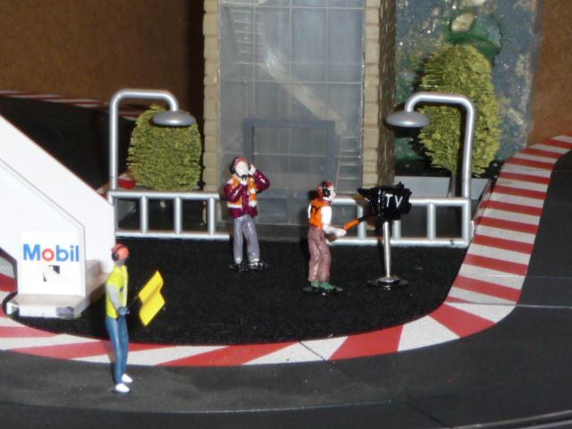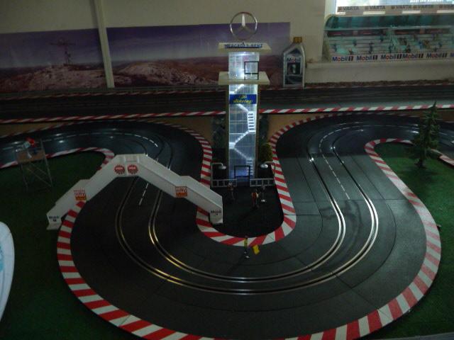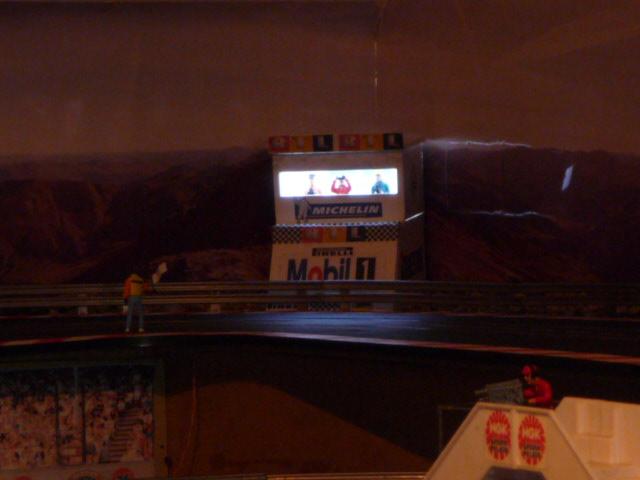 Die Sicht auf meine Bahn,hinter der Boxengasse war eingeschränkt.Das einfahren in die Boxengasse war ein Glückspiel.Deswegen habe ich ein 30 cm hohes Podest vor die Bahn gebaut um höher zu stehen .Vor kurzen habe ich mir das Cockpit-XP gekauft mit den 2CU Adapter für 3 Sektorzeiten und 1 Addon Paket mit 2 IR für das Speedlimit in der Boxengasse.SUPPER!!!Vor dem jetzt beleuchteten Mercedesturm habe ich drei 1/60 Kurven gegen eine Haarnadelkurve ausgetauscht.Ein Handbemaltest Kamerateam hält das Rennen für die Zuschauer im Detail fest.Die Rennbahn Aufsicht im RTL Häuschen wurde ebenfalls mit Licht ausgestattet.