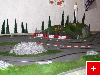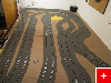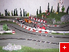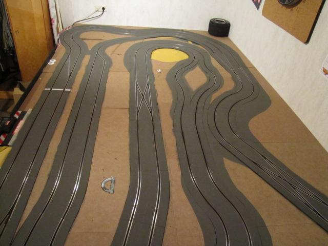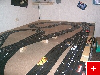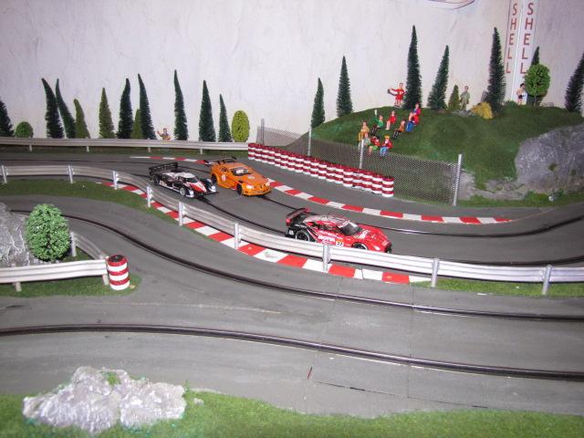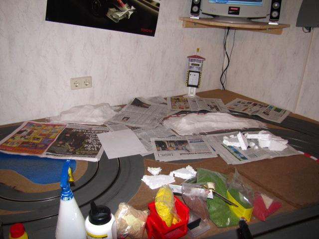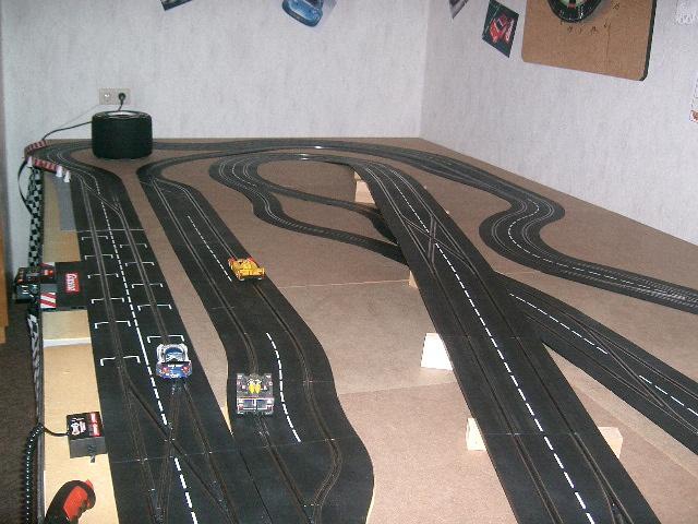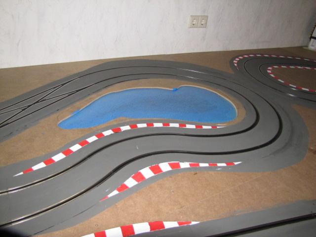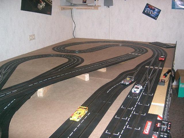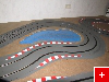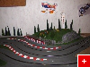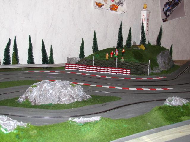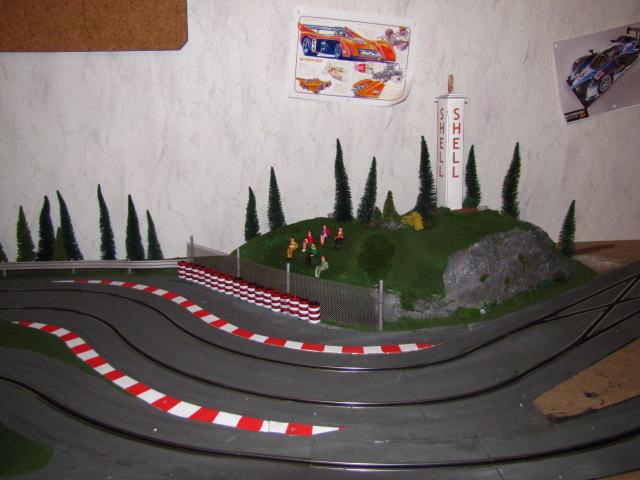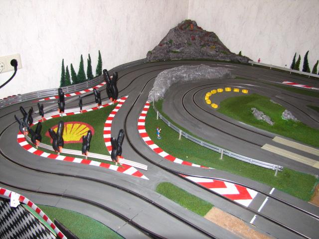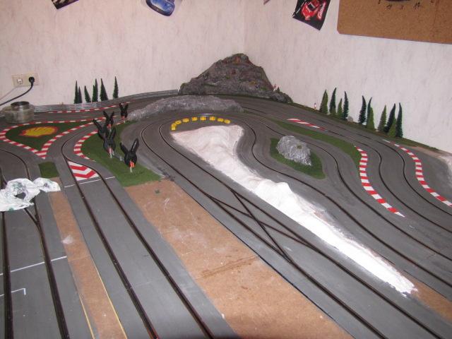Bei meiner Bahn handelt es sich um eine Carrera Digital 132 mit einer Streckenlänge von ungefähr 23 m. Bei der Bahn hatte ich anfangs eine Überfahrt geplant was mir aber optisch nicht so gefiel. Nach dem Umbau hatte ich das Problem das die Innenbahn einen Tick schneller war. Dieses habe ich gelöst indem ich die Schienen teilte sodass man auf der inneren Spur eine Schikane mehr hat, nun sind beide Spuren gleich schnell. Nach einigen Test Runden habe ich die Bahn komplett in 8 mm MDF Platten eingelassen, und wo es nötig war die Übergänge verspachtelt. So nun konnte es mit dem Landschaftsbau losgehen wobei dies absolutes Neuland für mich war. Ich wollte unbedingt einige Hügel und einen kleinen See kreieren was auch so einigermaßen gelungen ist. Des weitern sind so einige Bäume gewachsen. Danach habe ich die Bahn mit Dispersionsfarbe grau eingefärbt, und die Curbs aufgemalt. Als nächstes war die Boxengasse dran, diese ist zweispurig und sollte ein schönes Gebäude sowie eine Boxenmauer und Teamleiterstände bekommen.