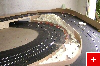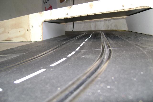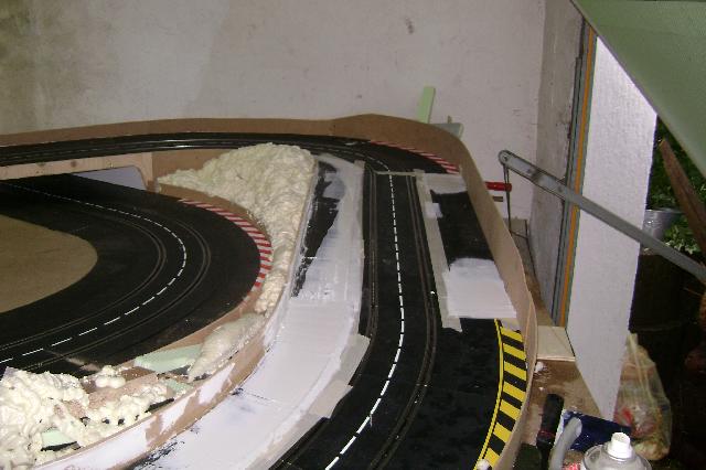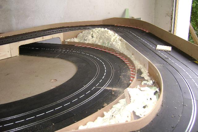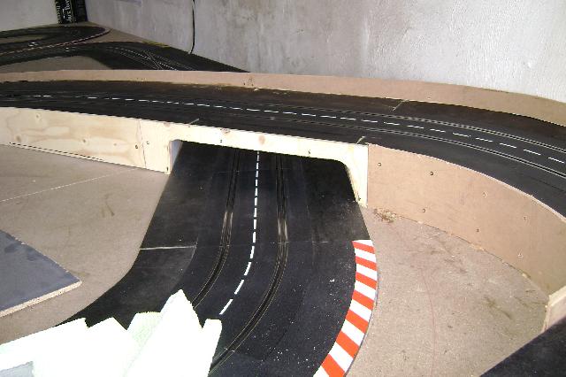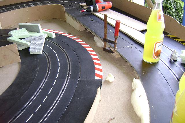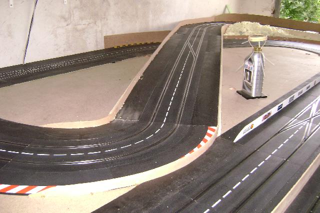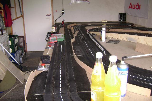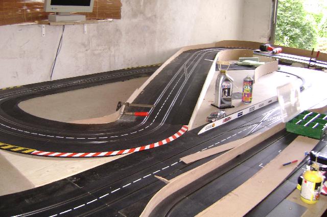 hab mir noch 6 3/30er kurven gegönnt und das layout komplett abgeändert!hab die fehlenden randstreifen aus 8mm mdf platten ausgeschnitten und schwarz lackiert.die leitplanken bestehen aus 3mm hdf streifen,die sollen auch noch farbe bekommen,wie zeit ist!:)