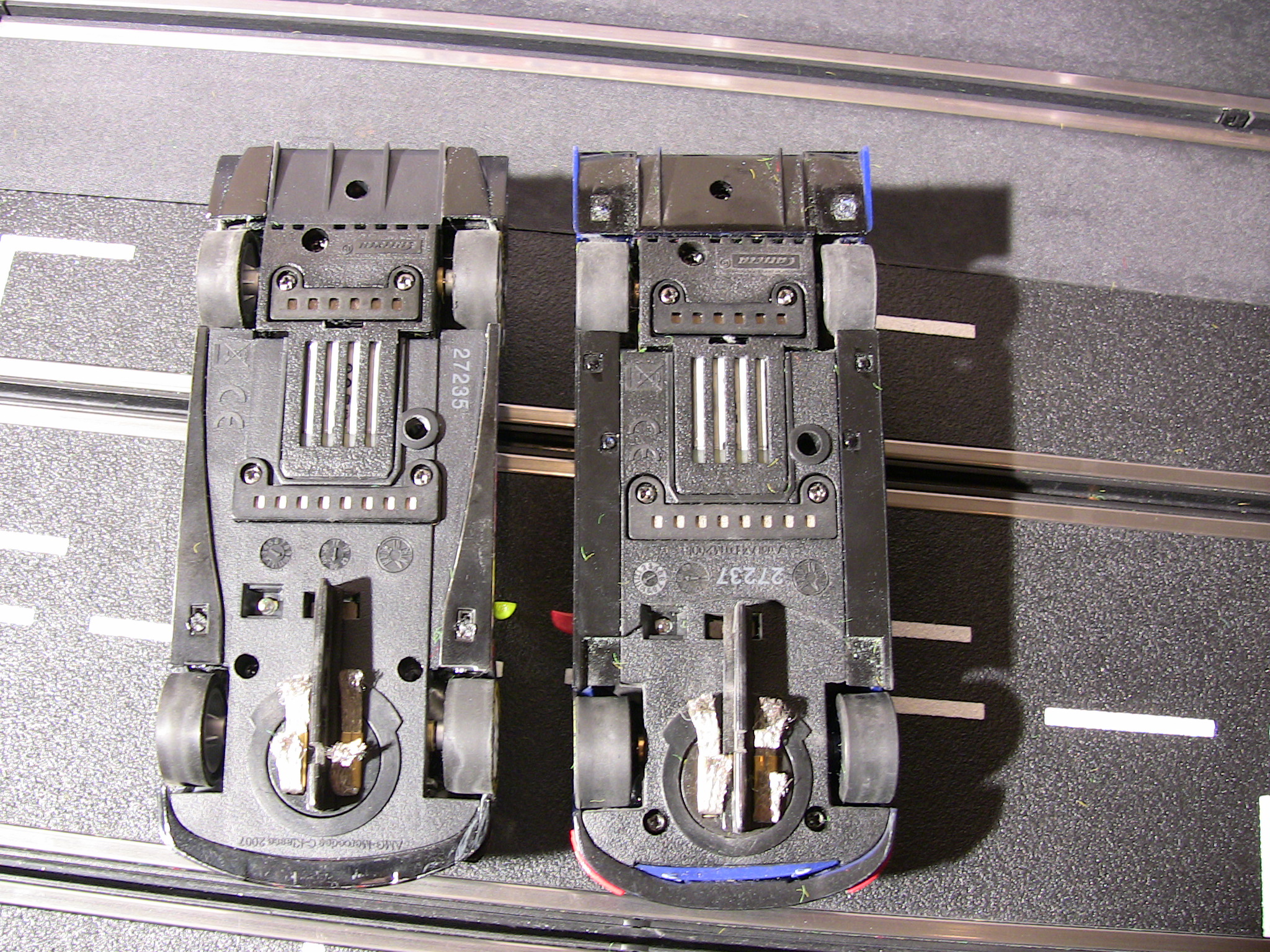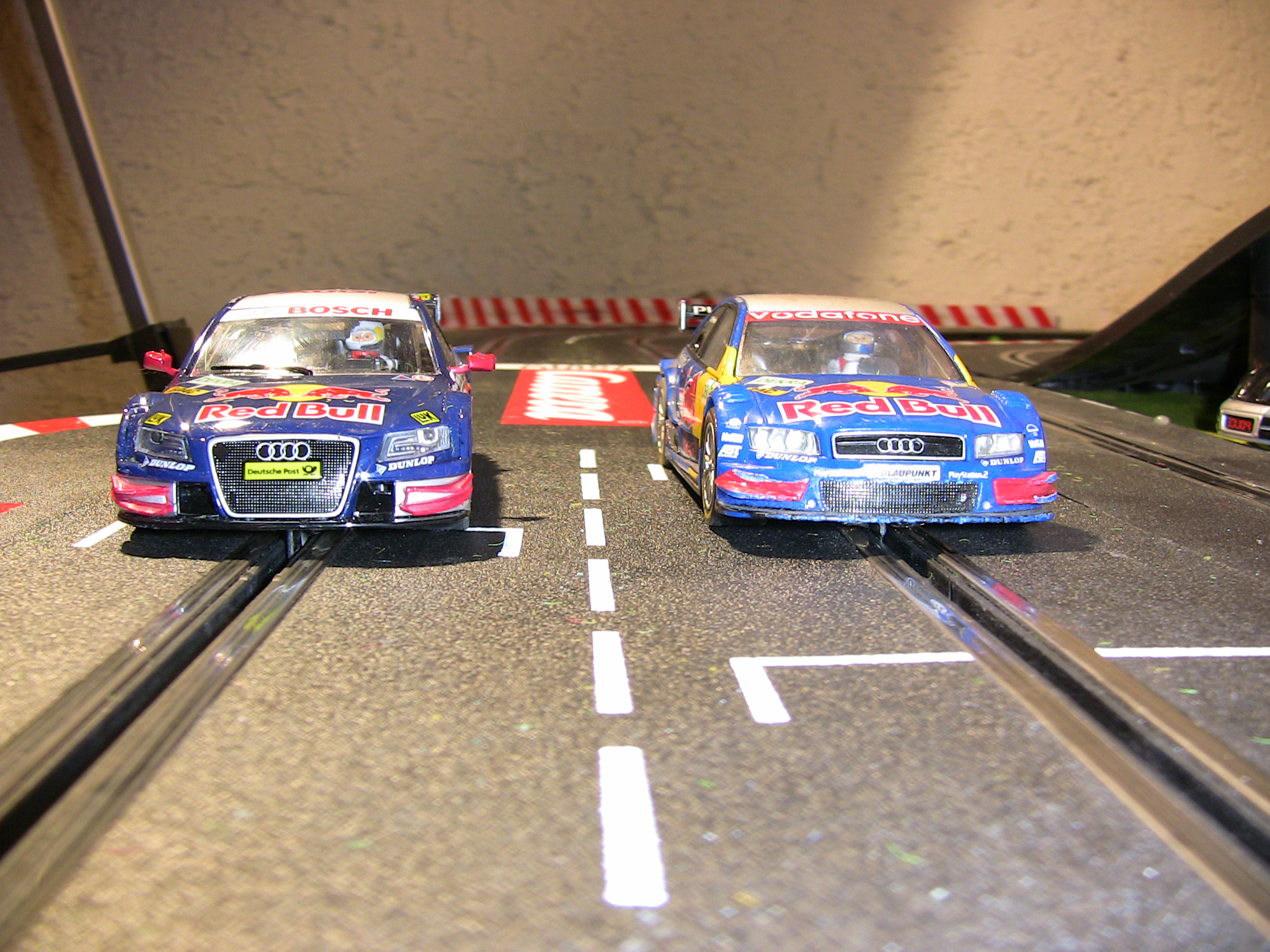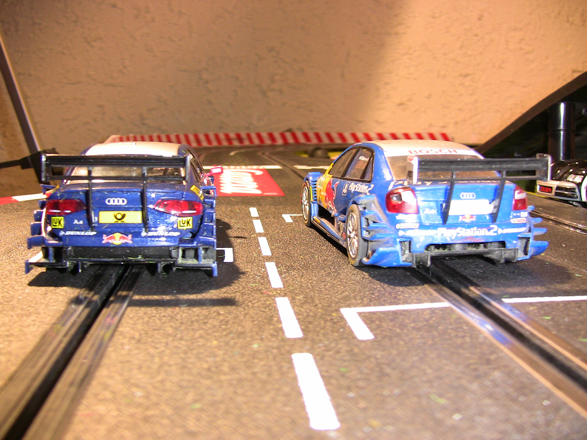 Die Evo-Startpackung mit den beiden von mir gewunschten Modellen ist am Wochenende e´ndlich eingetroffen. Schnell noch die Digitaldecoder eingebaut. Dabei ist mir zuerst aufgefallen, dass der Audi breitere Schlappen drauf hat (Bild 2) - bin gespannt ob man da beim Fahren einen Unterschied feststellt. Der Audi liegt zudem tiefer auf der Piste. Als Fotos auch gleich noch der Vergleich altes Fahrzeug gegen neues Fahrzeug.