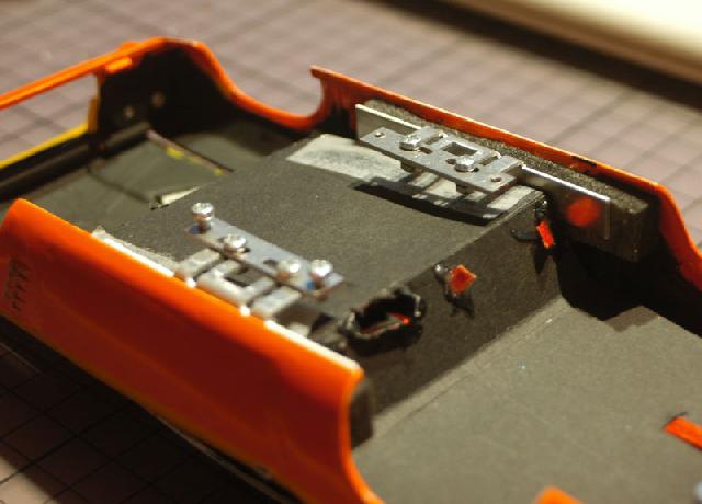 Das Moosgummi war auf der freien Seite bereits mit Kleber vorbehandelt. So musste ich nur noch die Seitenwangen der Karo-Halter mit Aceton o.ä. reinigen und das Chassis wie auf Bild 2 zu sehen einpassen - Seite für Seite, denn der Kleber auf dem Moosgummi kennt an einer fettfreien Fläche nur noch einen Zustand: Kleben fürs Leben! Wenn man sich vertut, kann man ohne Umschweife zum Skalpell oder Teppichmesser greifen und den Gummi aufschneiden - die Klebeverbindung löst man danach nur noch mit Lösungsmitteln.... Zumindest ist dies bei den von mir eingesetzten der Fall.