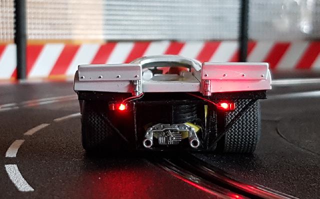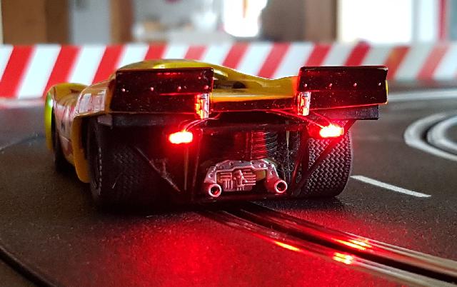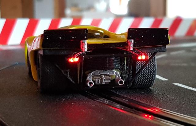 Nachdem ich im Internet dann mehr zufällig kleine, bereits verkabelte rote SMD-LEDs in der passenden Spezifikation gefunden habe dachte ich: geht nicht, gibt's nicht. Also für kleines Geld bestellt, flugs passende Stecker für den Digitaldecoder angelötet und die LEDs extrem vorsichtig mit Sekundenkleber am Heck des Boliden fixiert. Dann Kabel verlegt, angeschlossen, ausprobiert. Und das Ergebnis ist einfach nur cool...