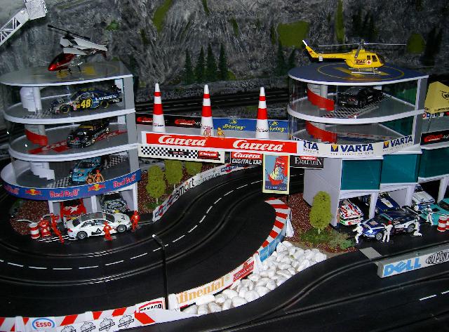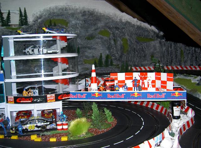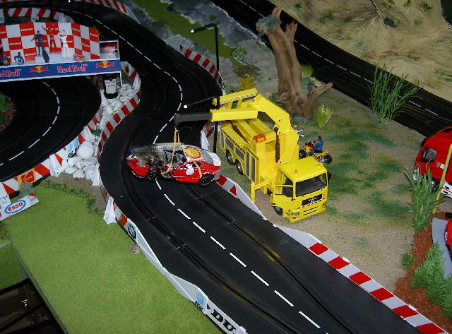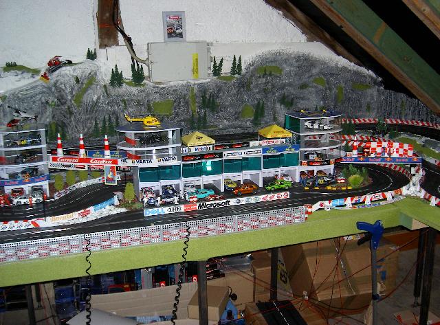 Viele Details und saubere Arbeit. Ich habe deinen Blog gerade entdeckt, und er war sehr kurzweilig beim durchstöbern. Solche Berichte die vom Anfang des leeren Raumes bis zum aktuellen Stand Alles zeigen, liebe ich. Dann noch die vielen Details, man kann sich gar nicht satt sehen. Der Pistenbully im Berg, die Quads, die Ferrari-Ecke, die Autos im Presseturm, toller Landschaftsbau usw usw..... Grandios - Bewertung 10 mit Sternchen (10 gerade erfolgt, Sternchen leider nicht gefunden). Übrigens, ich kann IngoH nur beipflichten, die Spurwechsel sind bei mir auch rausgeflogen, fährt sich deutlich runder. Allerdings habe ich noch die Engstelle........mal sehen. Auf meiner Strecke, auch in einem Blog ersichtlich, siehst du verschiedene Gebäude von Carrera4fun. Sehr zu empfehlen. Billiges Baumaterial und viel Spass beim Bauen. Gruß