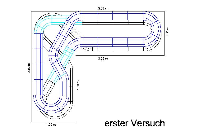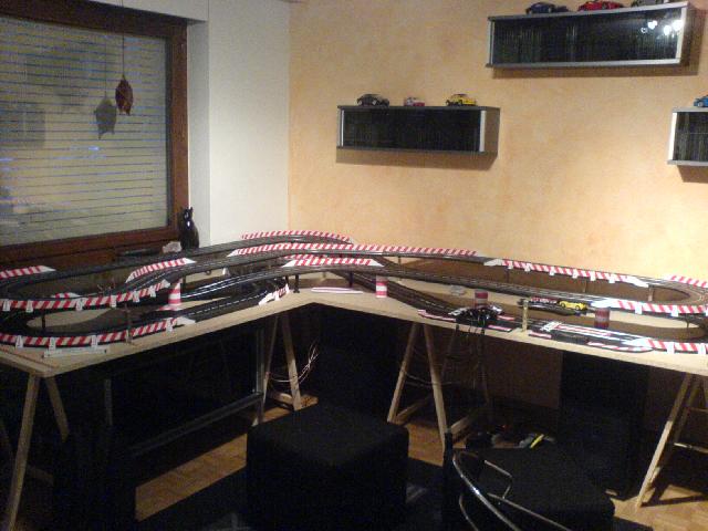 Den ersten Versuch startete ich vor ca. einem halben Jahr. Dabei wurde noch nichts mit dem PC ausgearbeitet. Ich ging guter Dinge in den Baumarkt und erwarb 3 Holzplatten mit den Massen 1.5 x 1.0 m und 6 Holzböcke als Auflager der Platten. Die Bahn hatte die Form eines L mit der Grösse 3.0 x 2.5 m und man stand im Innenwinkel des L. Durch den Kauf einer zweiten Grundpackung und diversem Schienenmaterial konnte ich nun eine 2-spurige Bahn aufbauen die immerhin fast 19 m Länge aufweisen konnte. Dies habe ich nur geschafft indem ich viele Überfahrten und Brücken verbaut habe. Die Randstreifenverbreiterungen habe ich selber aus Holz gemacht, 6 cm breit. Dadurch stiessen die Fahrzeuge beim Driften ständig mit dem Heck gegen die Banden. So ruinierte ich zwei Heckflügel und fing viele Lachschäden ein. Nach etwa 2 Monaten verleidete es mir und baute die Bahn komplett ab.