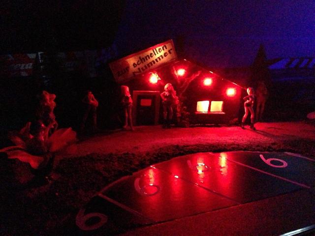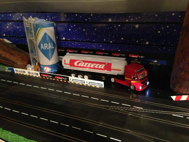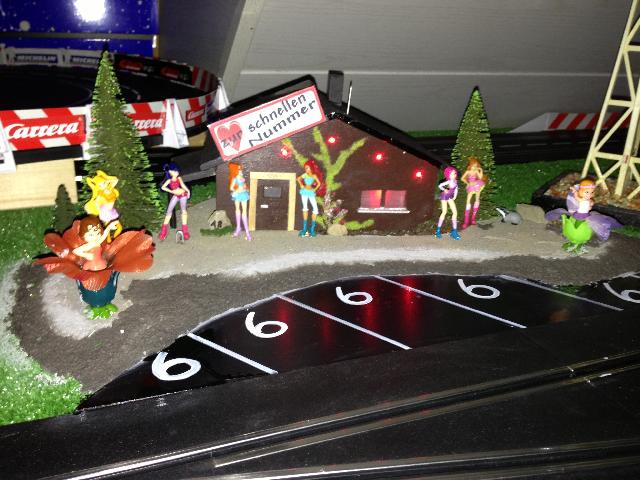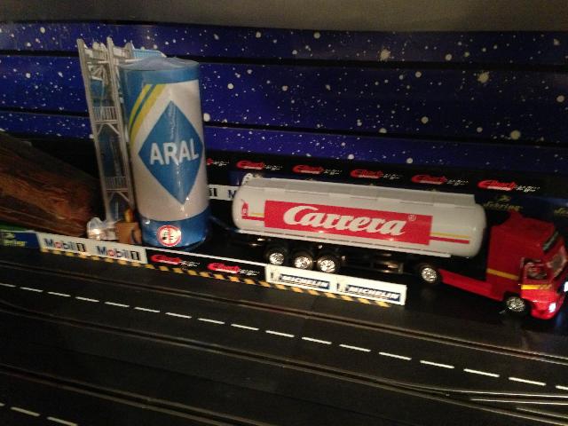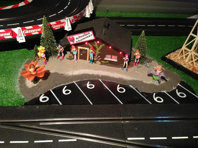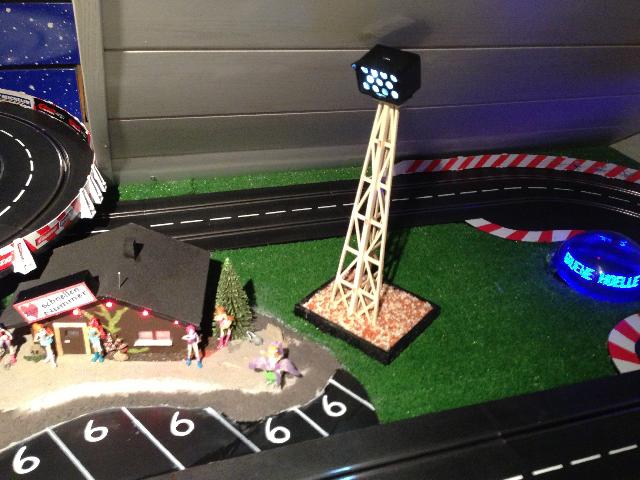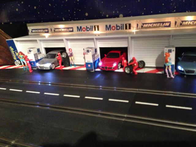 in der boxengasse stehen pkw die ich mit smd ausgerüstet habe sowie eine leuchtwerbung aus einer zerschnittenen weihnachtsbeleuchtung im oberen bereich