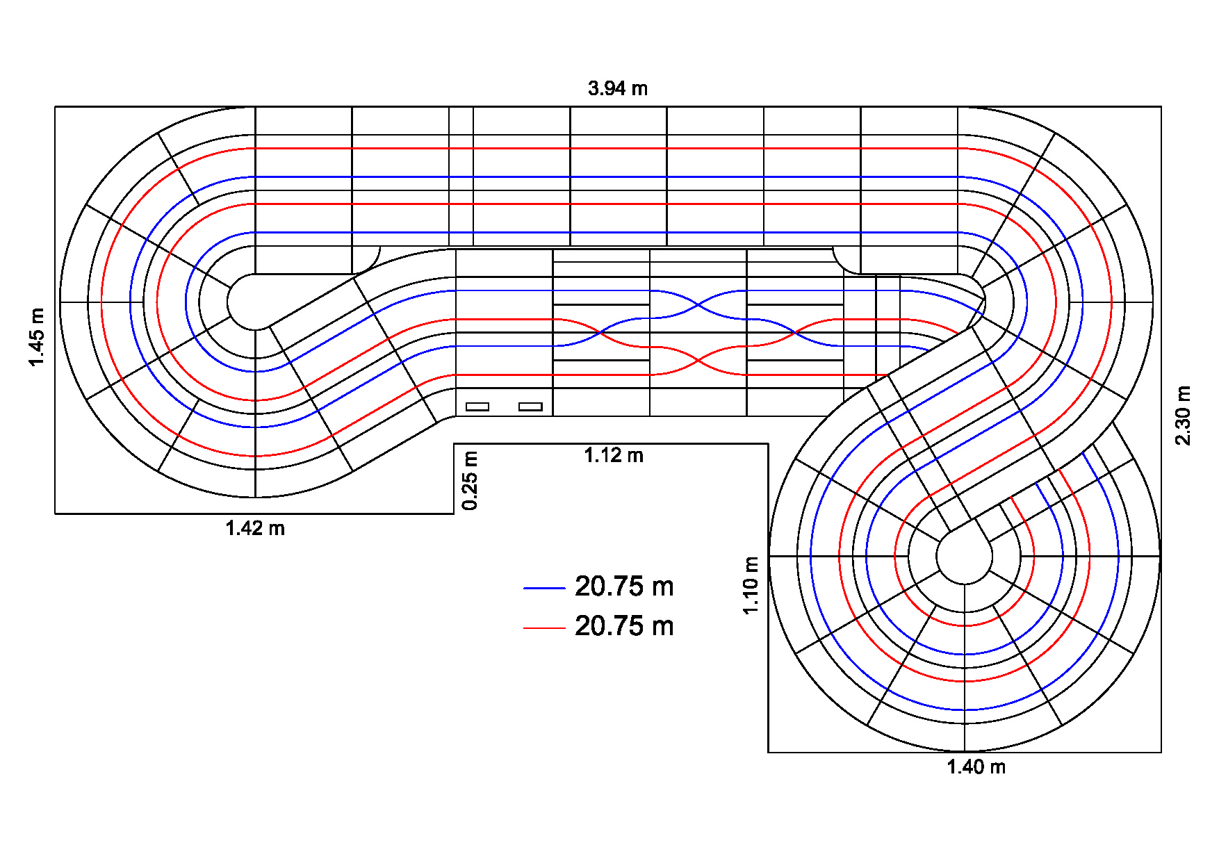 Die Bahn wurde anhand eines CAD-Programm erstellt und die beiden Fahrspuren sind auf den Millimeter genau gleich lang (2 x 20,75 m). Um eine Runde zu absolvieren fährt man zweimal um den Kurs, jedoch durch die Kreuzung in der Start/Ziel Geraden abwechselnd in einem anderen Slot.
