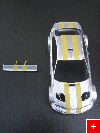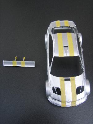 Zuerst habe ich auf dem Mittelteil (Frontschürze, Motorhaube, Dach, Kofferraumdeckel) in drei Schichten (zwischen jeder Schicht ca. eine Stunde trocknen lassen) silberne Farbe aufgesprüht. Danach mit Tamiya Masking tape zwei Streifen abgeklebt (siehe Bild 2).