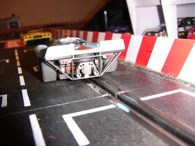 OK rauf auf die Bahn mit den Teilen! Gas geben und uiuiuiuiuiui. die 25tausend U/Min gehen ab! Die Reifen bringen die Leistung auf die Strecke - mein lieber Herr Gesangsverein! Tja und da war es dann wieder. . .wegen der kurzen Stromabnehmer blieb das Auto ständig bei den Weichen stehen. Und noch was gefiel mir nicht: Ich hatte vergessen die Magnete rauszunehmen! Welch Schande! Also aufschrauben Magnete weg und nächster Versuch. (Ach ja ohne Magnet und Innenleben aber mit d132 Decoder wiegt das Teil jetzt genau 73 Gramm). Also - Auto auf die Bahn: Zum zweiten mal: KRASSSS! Auch ohne Magnet die Reifen bringen die 25k trotz des geringen Gewichtes satt auf die Strecke. Das Auto geht ab wie eine Rakete und jetzt das Wichtigste: Lässt sich butterweich durch die Kurven gleiten. Es ist ein unglaubliches Gefühl - man hat jede menge Power in der Hand! Der Regler wird maximal zu 50% durchgedrückt - lediglich auf der 3,5m Geraden wird für Millisekunden durchgedrückt. Der Motor kreischt auf und sofort ist das Auto bei der Kurve, wo es sanft driftend perfekt und spurstabil dahingleitet. Übrigens stören ohne Magnet auch die kurzen Schleifer nicht: Das Fahrzeug gleitet super über die nicht stromversorgten Schienenteile.