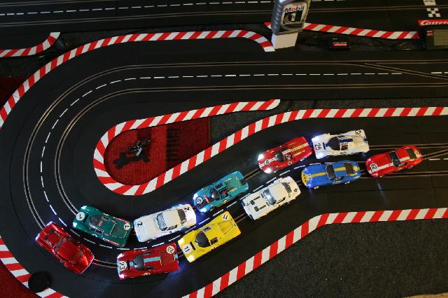 den Festaufbau fertig zu haben und dann zu merken, dass es hier und da nicht funktioniert. Von daher sollte man schon von vorneherein alle Möglichkeiten durchplanen und die Bahn erstmal gründlich testen. Die Magnet sind bei vielen Fahrzeugen - auf alle Fälle bei den 124ern - meiner Meinung nach vollkommen überflüssig und gehören in die Gattung "Kinderspielzeug". Also raus damit bei so ziemlich allen Fahrzeugen ( bei den 132ern kann man die Autos mit ein wenig Blei beschweren, muss aber bei vielen Autos auch nicht sein, bei Nincos kann man sie ersatzlos weglassen, bei Slot.its reicht es oft schon aus, wenn man die Felgen so weit wie möglich nach außen setzt und die vier Motorblockschrauben etwas löst, um das Kurvenfahren zu erleichtern, bei anderen Herstellern habe ich leider keine Ahnung ). Natürlich werden die Rundenzeiten durch das Weglassen der Magnete langsamer, der Fahrspaß erhöht sich aber nach einer gewissen Eingewöhnungszeit erheblich! Zu den Kurven: Es wird oft geschrieben, dass Kurve 1 langweilig ist. Der Ansicht bin ich nicht, ich verwende Kurve 1 sehr häufig, weil das einfach das Fahrgefühl trainiert. Beim Festaufbau sollte man allerdings auch andere Kurvenradien verwenden und vor allem sich öffnende oder schließende Kurven, sowie Schikanen mit wechselnden Radien einbauen, langfristig macht das mehr Spaß. Dadurch, dass du nur zwei Meter Breite zur Verfügung hast, bist du natürlich ein wenig eingeschränkt; wenn ich das richtig im Kopf habe, hat z.B. Kurve 4 inkl. Randstreifen über 2m Durchmesser. Also Streckenplaner raus und einfach mal wild drauflosplanen. Gut finde ich übrigens die lange Gerade mit den zwei Weichen, da kann man seinen Gegner ganz schön ärgern :-)
