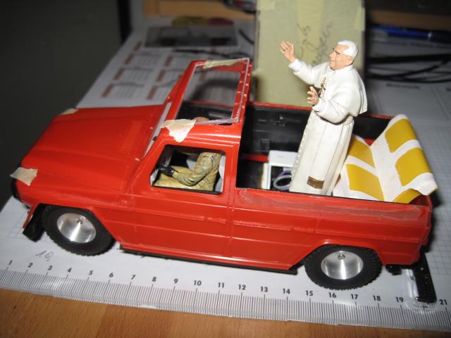 Aus zwei mach eins. Hier habe ich einen Revellbausatz Mercedes-Benz 230 G-Modell und den Audi Union Typ C von Carreradigital 1:24 zerlegt und zu einem Papamobil umgebaut. Der Radstand von dem Audi hat genau unter die Karosse von dem G-Modell gepasst. Bei dem Modell, also der Karosse mit dem Plexiglasaufbau musste ich sehr viele Kompromisse eingehen, um das Modell so hinzubekommen.