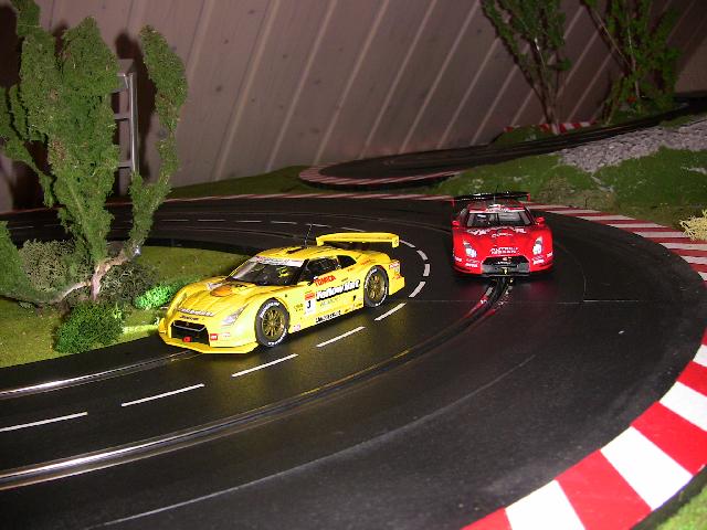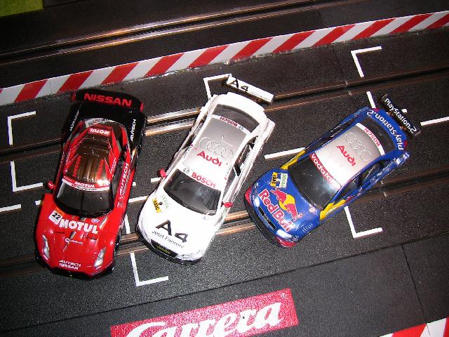 Die beiden Mercedes: Der Silberpfeil ist wirklich schön kommt aber gegen die kernigen Nissans nicht an. Der orange Mercedeshmwas wäre der klasse, wenn Carrera ein Metallicorange genommen hätte! Aber so sieht das Fahrzeug aus wie ein Plastikspielzeug (was es ja auch ist aber es muss ja nicht so aussehen). Selbst im Rennen wirkt das orange recht billig und unecht.