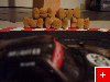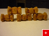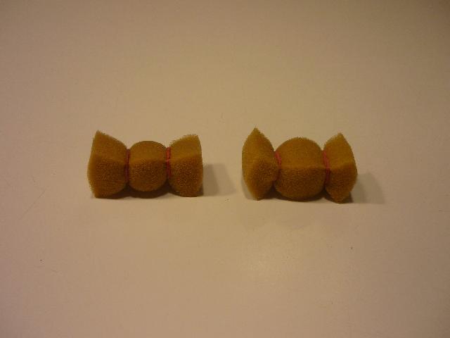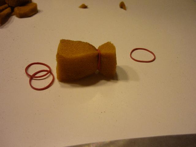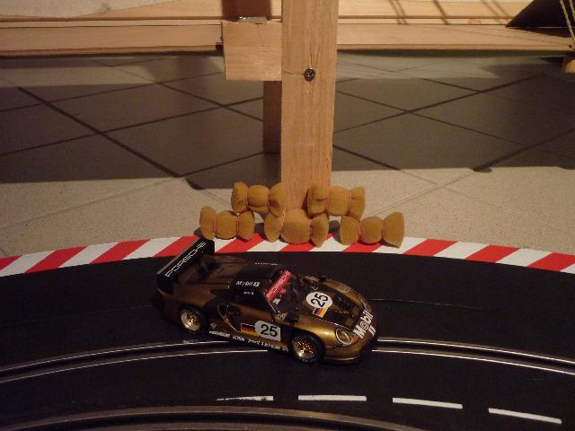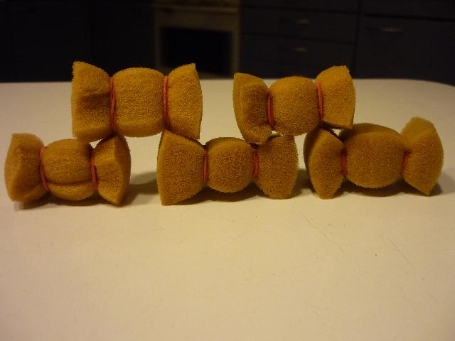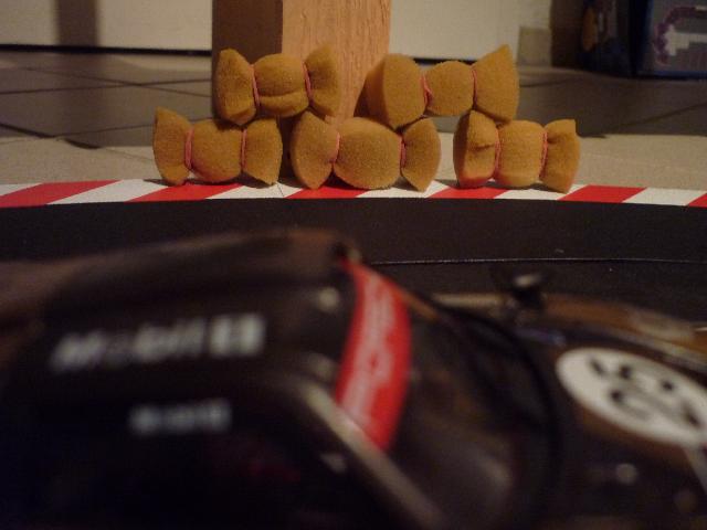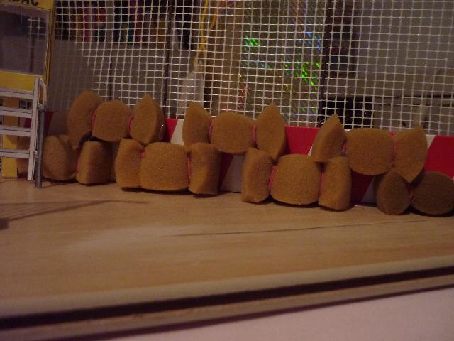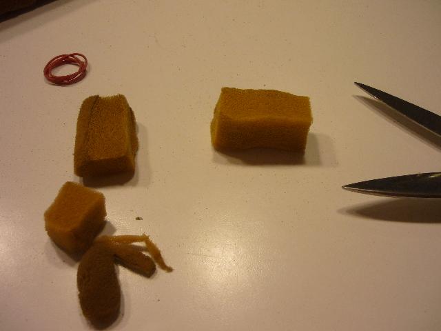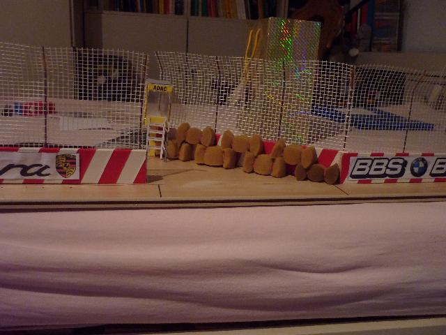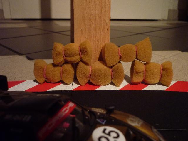 Die Strohballen hab ich mit einer Schere aus einem Stück Schaumstoff ausgeschnitten und jeweils mit zwei Gummis umspannt. Die einzelnen Strohballen hab ich dann noch mit Heißkleber zu gößeren Einheiten zusammengefügt und an der Strecke verteilt.
