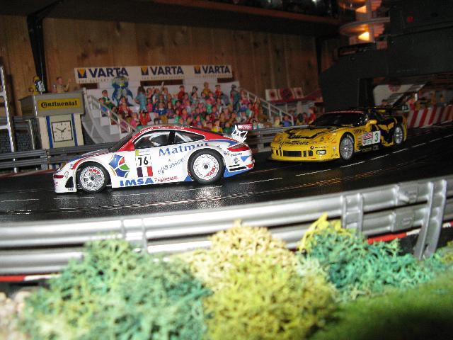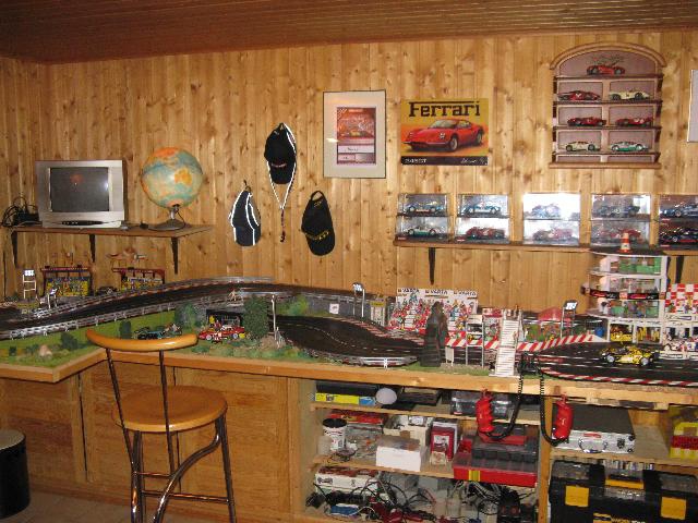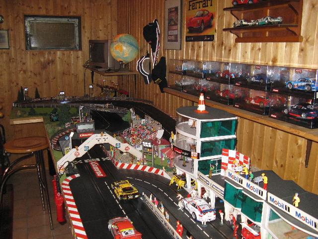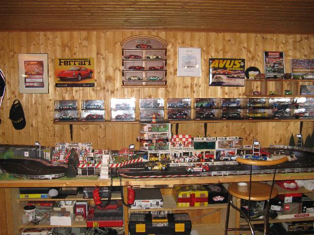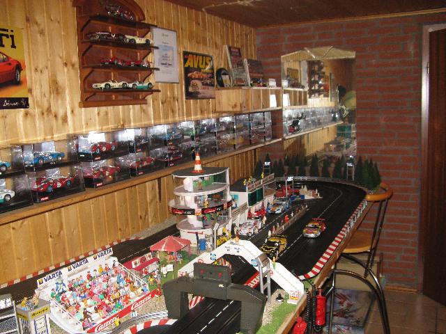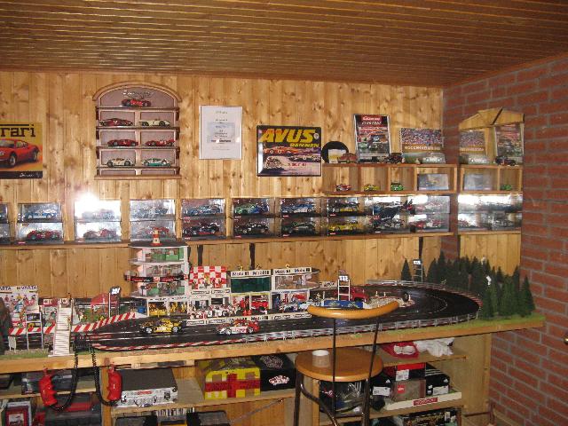 Zum Jahresende hab ich mal ein paar Bilder von der gesamten Bahn und dem Raum gemacht. All zuviel Platz hab ich hier leider nicht. So will ich mal zeigen, wieviel Hobby man doch auch auf ganz kleinem Raum unterbringen kann. Die Bahn hat insgesamt nur eine Grundfläche von 4,62 x 1,30 m. Wobei nur der hintere Teil mit der Auffahrt zur Brücke 1,30 m breit ist. Die restliche Bahn ist nur 1,oo m breit.Immerhin hab ich eine ganze Wand für mich und meine Sammlung. Mit dabei sind noch ein paar Blechschilder und Urkunden für ein bisschen "Renn-Atmosphäre". Aber, wie man sieht, Platz ist in der kleinsten Hütte. Das letzte Bild ist mein "neuestes" Auto. Porsche GT3 von Avant Slot. Schöne Grüsse Harry