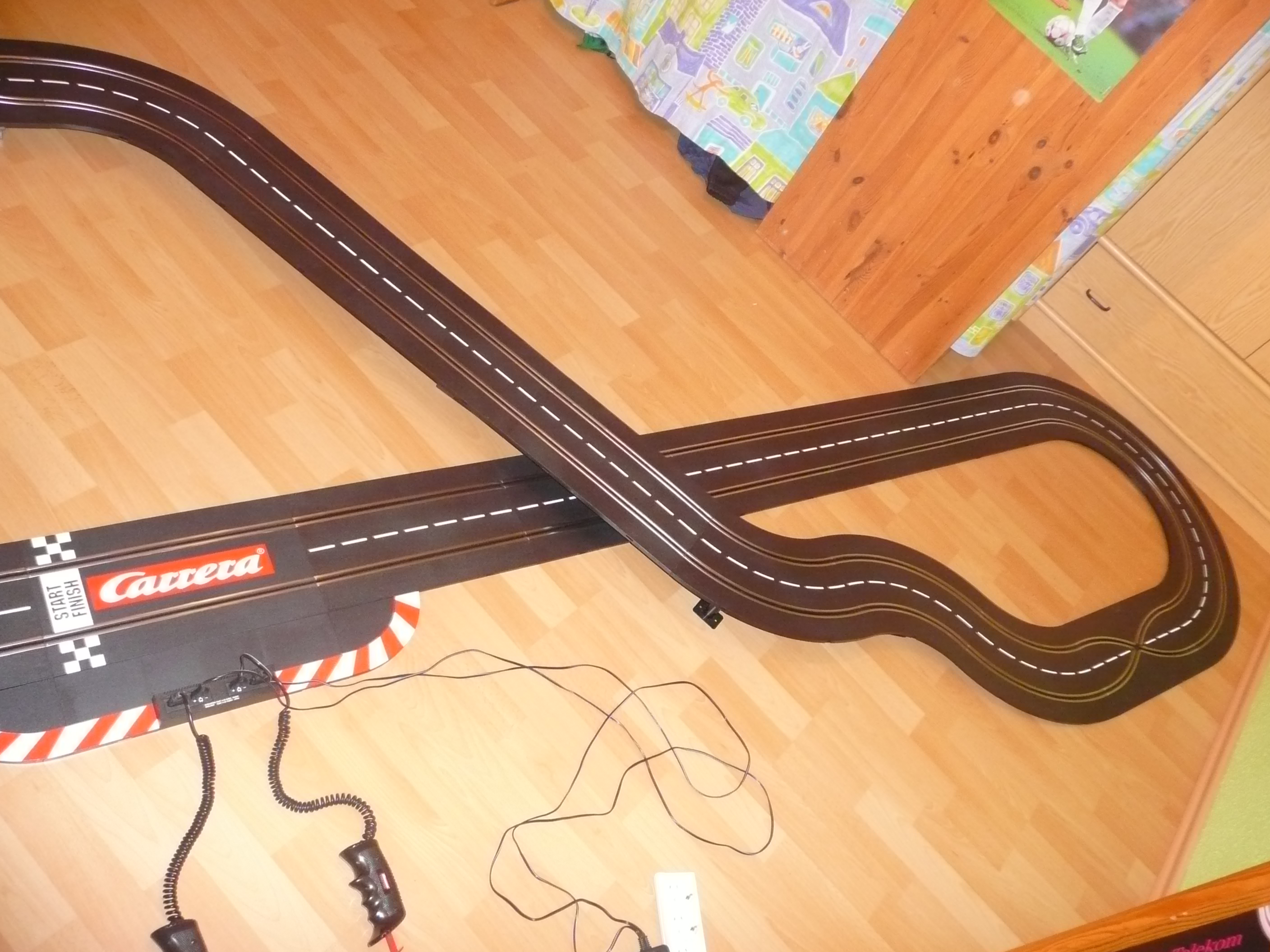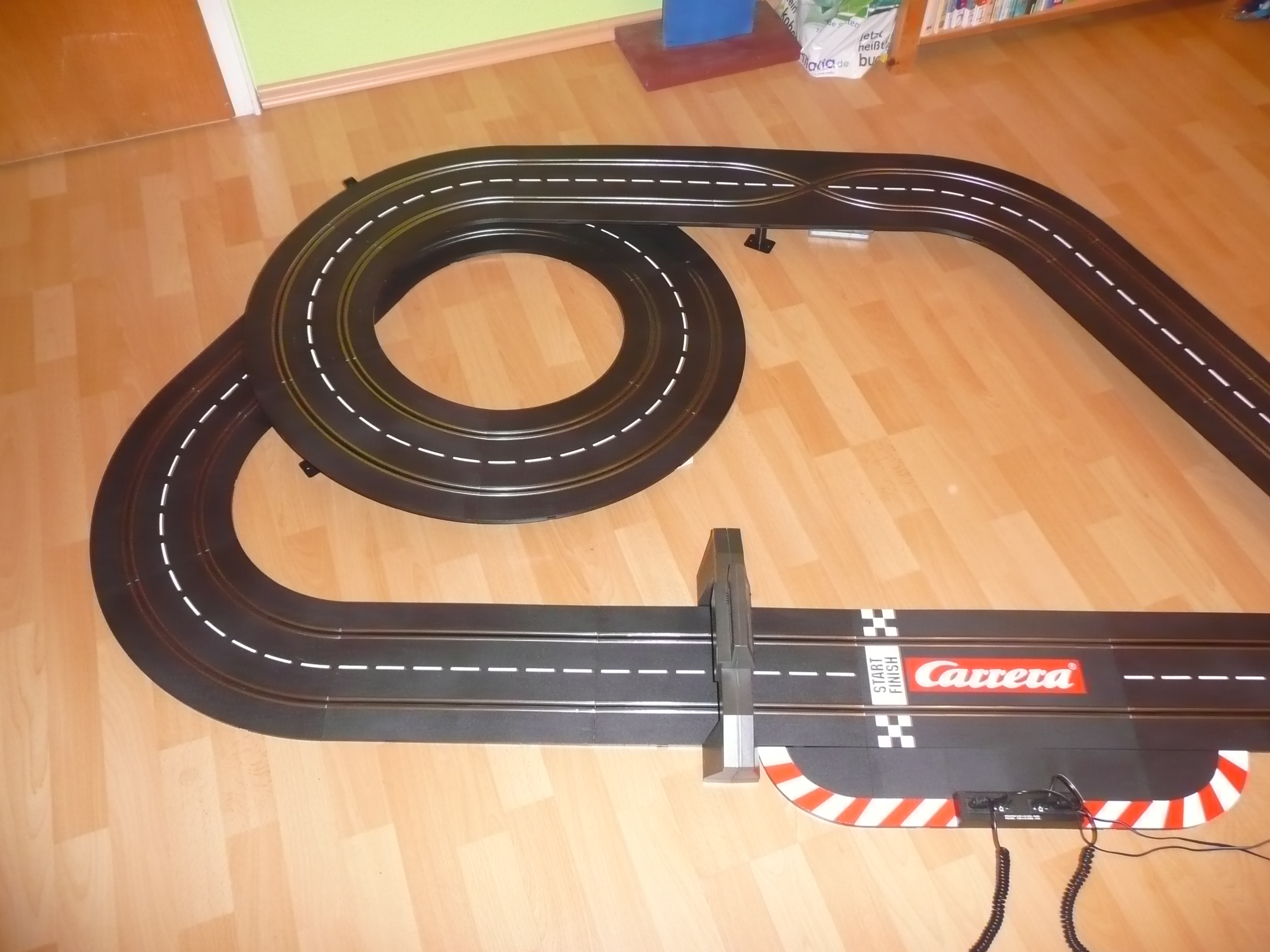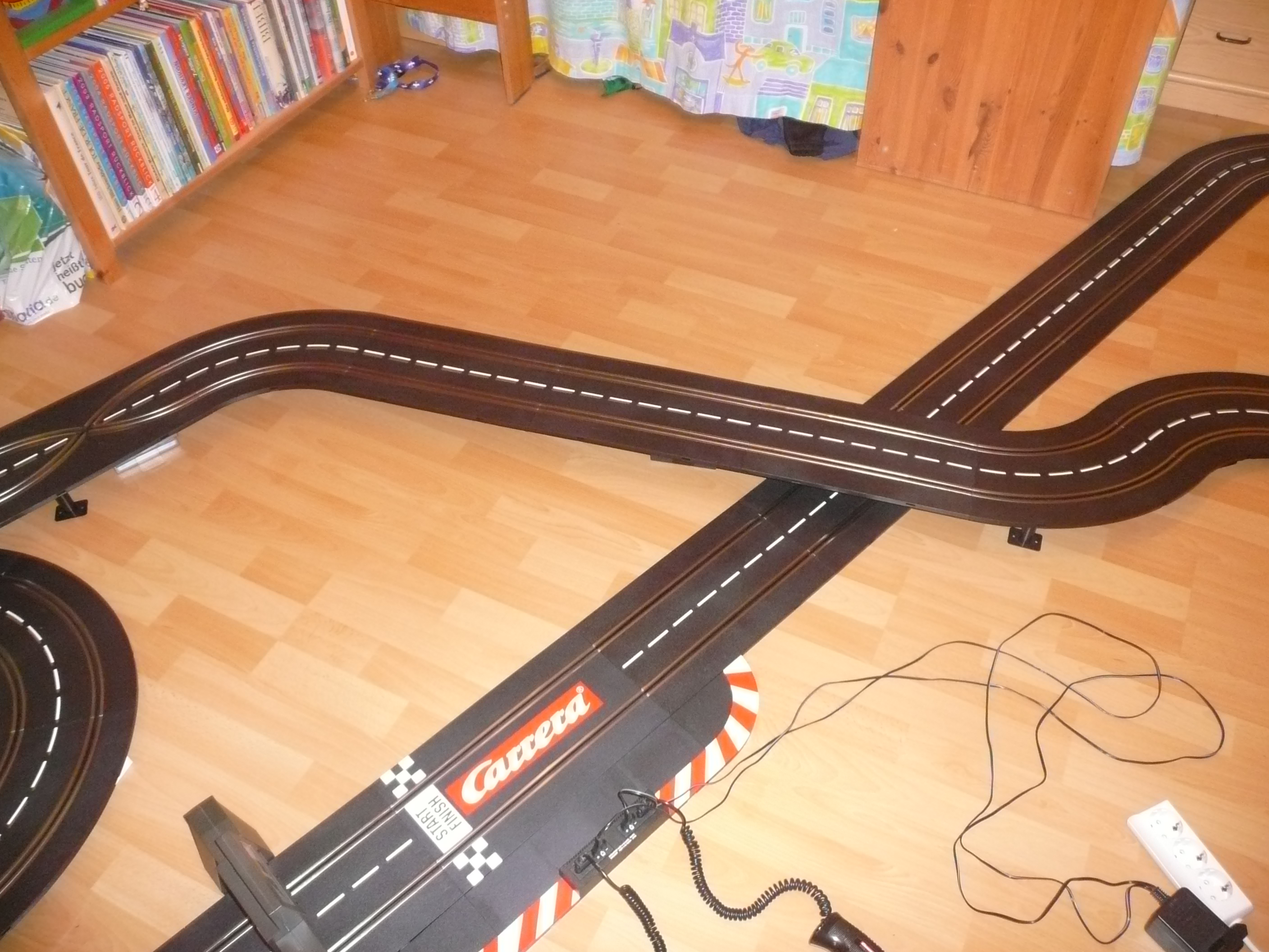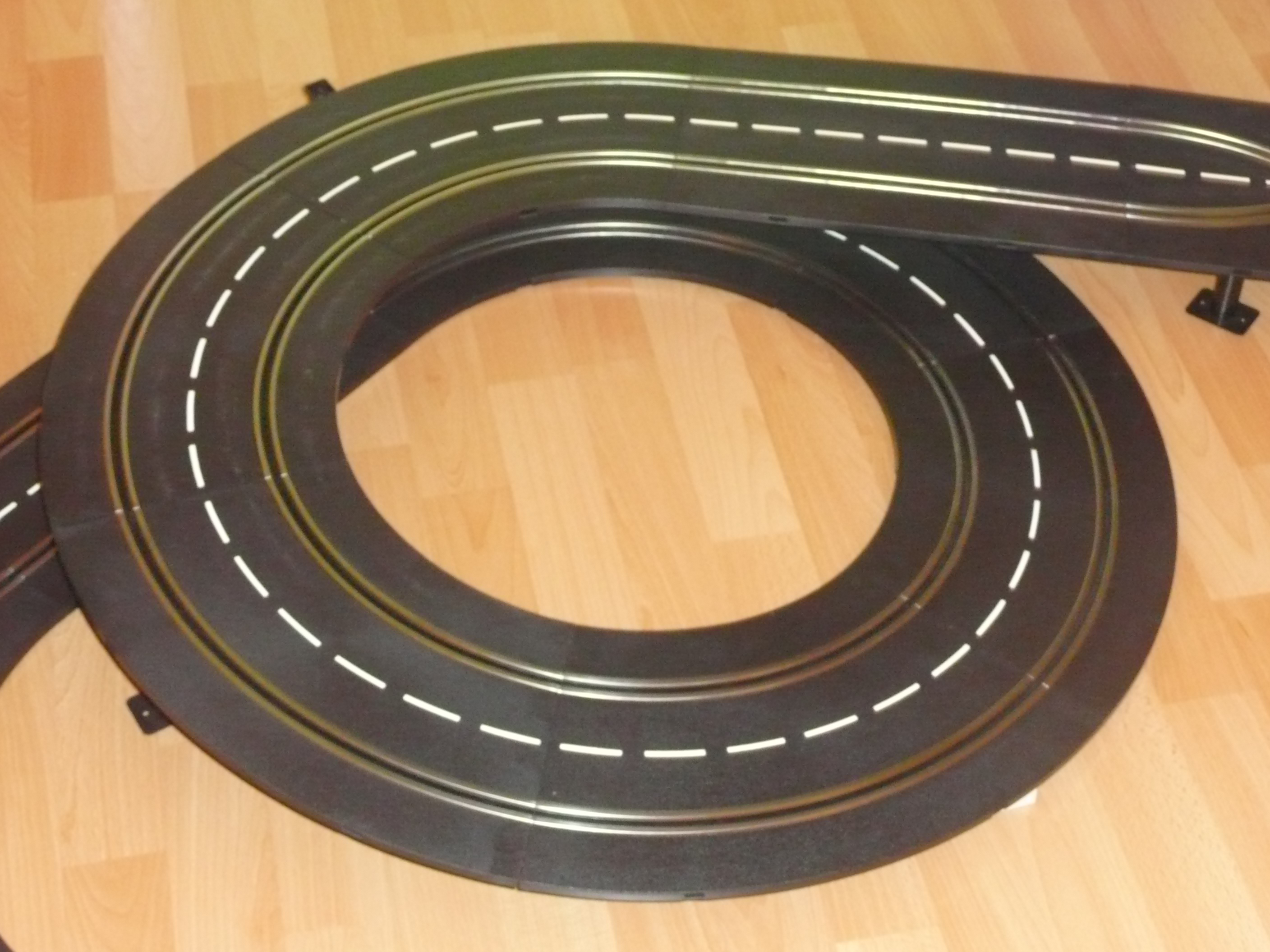 Zu Weihnachten gab es die ersten Erweiterungsteile. Natürlich habe ich mich gleich ans Bauen gemacht. Die Bahn ist ca. 8m lang und hat zwei Spurwechsel. Da mir eine lange Gerade sehr wichtig ist, habe ich diese zuerst gebaut. Meine Bahn soll aber trotzdem abwechslungsreich und schön sein. So habe ich verschiedene Kurven eingebaut. Das Rondell is schön zu fahren, vor allem auf der Innenbahn. Außen ist es nicht ganz toll. Das liegt daran, dass ich leider keine Randstreifen habe. Die stehen auf meiner Einkaufsliste aber ganz oben! Die Überfahrt kann man gut nehmen. Bei der kurzen Schlangenlinie muss man etwas aufpassen, damit man nicht ins Schlingern kommt. Nach der 180° Kurve geht es auf die lange Gerade. Insgesamt ist die Bahn schön zu fahren und passt genau in mein Zimmer :-)