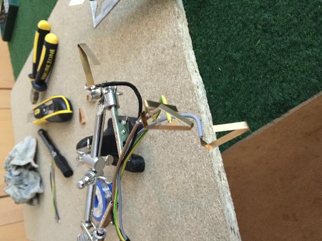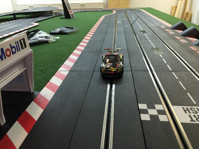 Nach etwas längerer Bau Unterbrechung geht es wiede voran. Es wurde zum ersten Mal die Bahn auf die Platte gelegt um die Zusatzeinspeisungen einzubringen. Insgesamt wurden 12 Zusatzeinspeisungen in die Bahn eingebracht. Die Kabel wurden kostengünstig im Baumarkt besorgt und zusammen mit den gekauften Kupferklammern verlötet. Für das anbringen der Kabel an allen Stellen der Bahn gingen gute drei Tage ins Land. Erst dann durfte das erste Auto ein paar Proberunden auf der Strecke zurücklegen. Auch wenn die Überfahrt noch von Hand angehoben werden musste, war es ein sehr schöner Moment.