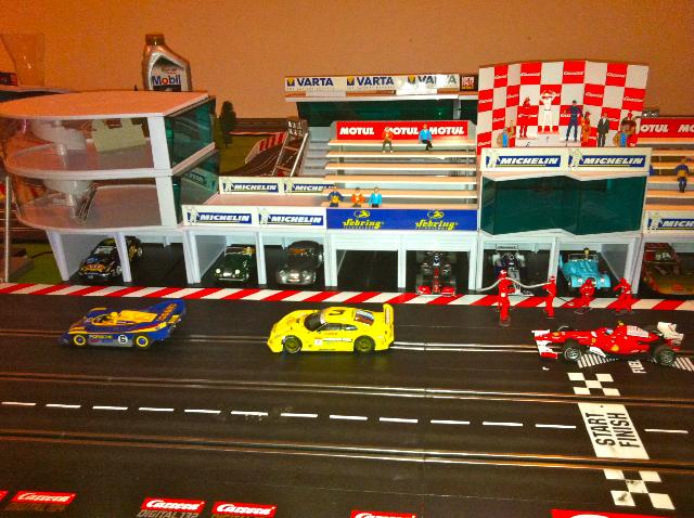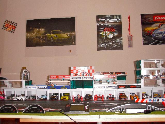 Hab wieder etwas gearbeitet und seeehhhhhrrrrr viel investiert. Eine Boxengasse ist dazugekommen, Heuballen, Absperrgitter und 7 (ja, sieben) neue Digitalrenner von Carrera. Damit hätte ich auch gleich in die Firma einsteigen können, meinte meine Frau und verringerte mein wöchentliches Taschengeld ;-))). Aber bitte guckt selbst bei den neuen Pics.