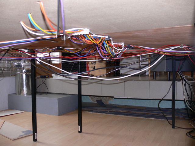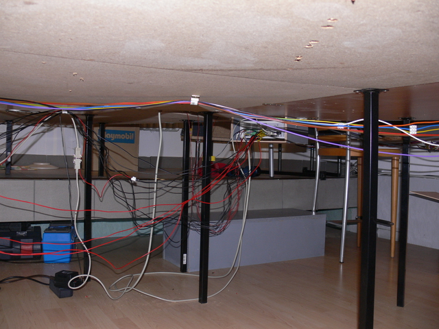 Auf 2 Bildern erkennt Ihr die Kabel unter der Platte. Für Elektriker sind diese Fotos nicht geeignet, sie könnten wegen der Art der Verlegung in nervöse Zuckungen verfallen. Es war schon ziemlich mühselig; die Elektrik hat eigentlich die meiste Zeit in Anspruch genommen. Ich werde die Kabel auch noch etwas besser an der Platte befestigen.