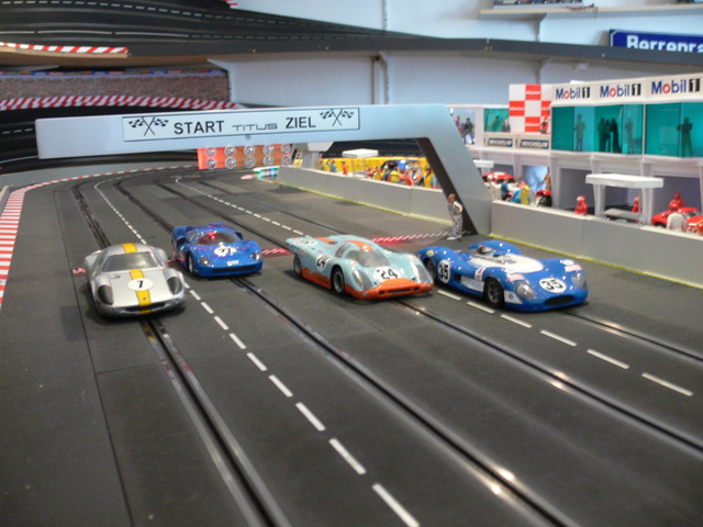 Klasse Bahn! Gratulation. Würd ich auch mal gern drauf fahren. Eine Frage zu Bild 4: Was sind das für Fahrzeuge, speziell der Porsche 917, Porsche 904 und der Matra(?)? Eigenbauten? Über Info wäre ich dankbar. Gruss netzer
