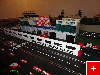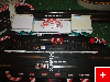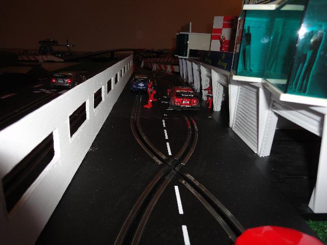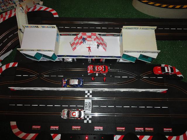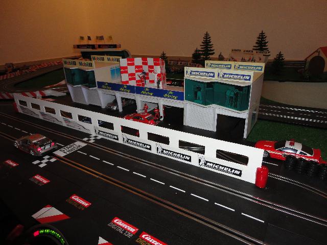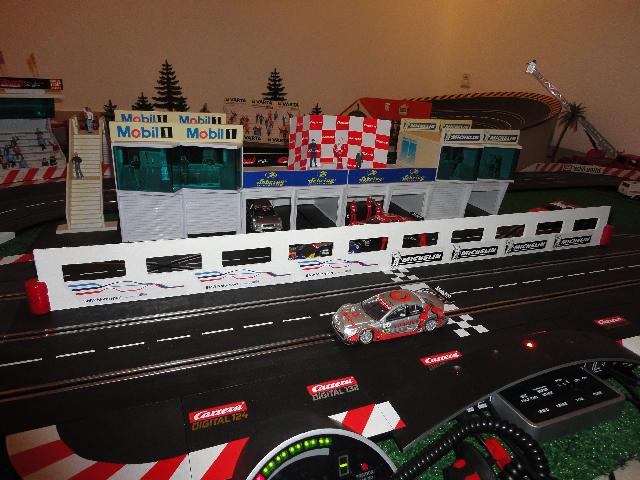 Meine Boxenmauer ist aus drei lagen Pappe verklebt, wobei die mittlere Lage länger ist und zwischen den Schienen klemmt. Anschließend Fenster ausgeschnitten, angestrichen und beklebt.