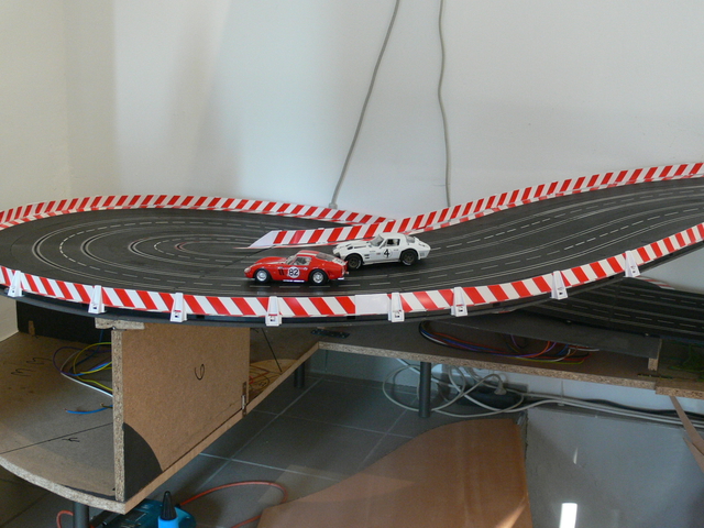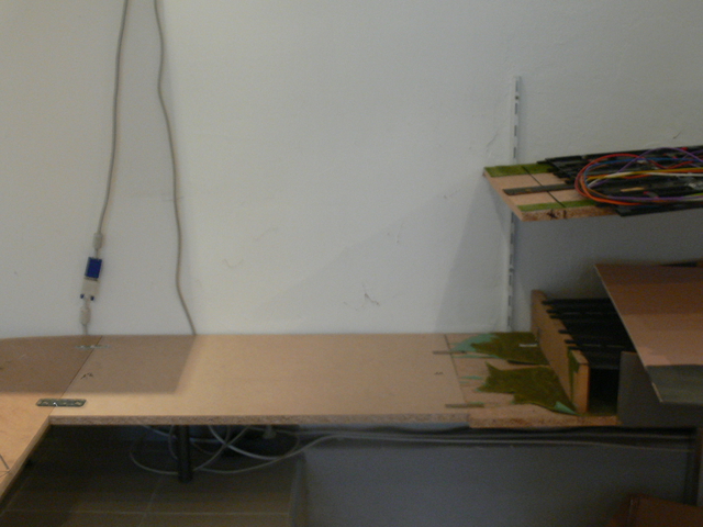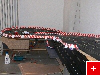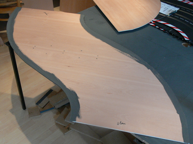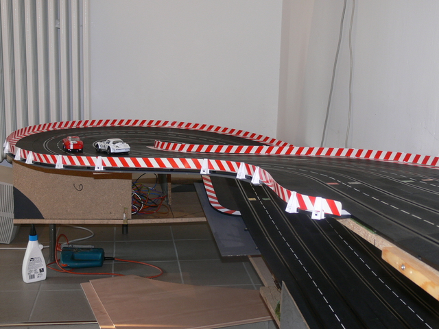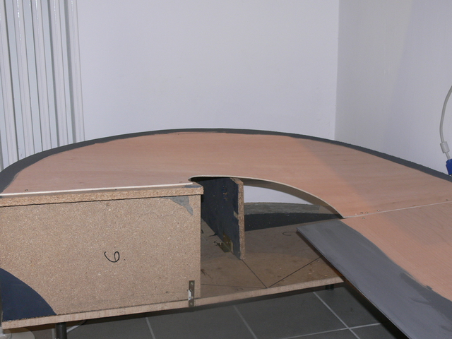 nach 2 Wochen hatte ich wieder Zeit, weiter zu bauen. Auf dem Programm stand die Verbindung zwischen den Ebenen am linken Ende der Anlage. Zunächst seht Ihr den Unterbau aus 19mm Spanplatte. Danach die ebenfalls aus Spanplatte gebauten Stützen, die mit Metallwinkeln auf der Grundplatte verschraubt wurden. Darauf habe ich dann Trassenbretter aus 4mm Sperrholz geschraubt. Die letzten Bilder zeigen die fertige Abfahrt, die Verkleidungen kommen noch. Die Abfahrt überwindet einen Höhenunterschied von etwa 40cm. Auch die obere SK habe ich schon fertig, allerdings jetzt kein Bild.